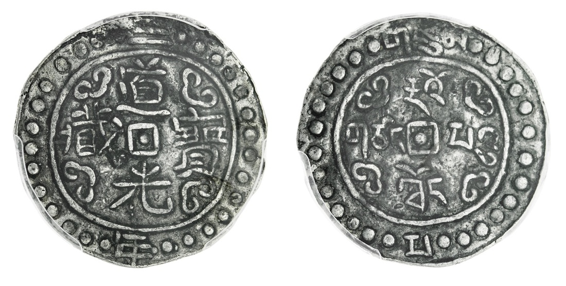 Tibet, Dao Guang, Sho, 3rd Year (1823), 28 beads, 14 either side of date, rev. 26 beads, 13 either side of date, (cf. Rhodes, lot 110; LM 649; KM C93), lightly crimped, otherwise a pleasing strike, good very fine, elongated bead to reverse at 1 o'clock as commonly encountered, in NGC holder, graded PCGS Genuine ~ BENT XF DETAIL (Cert. #48254101)