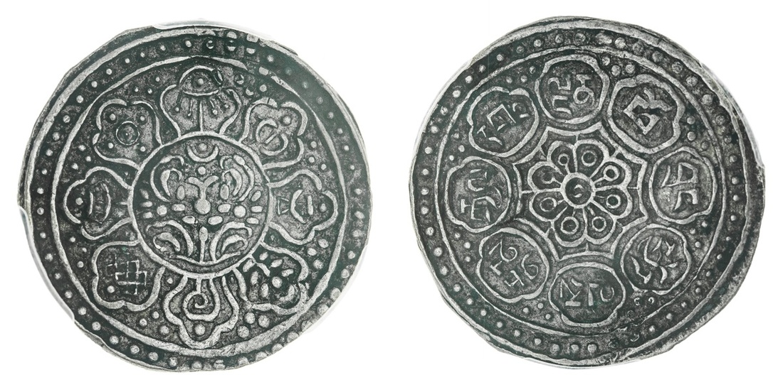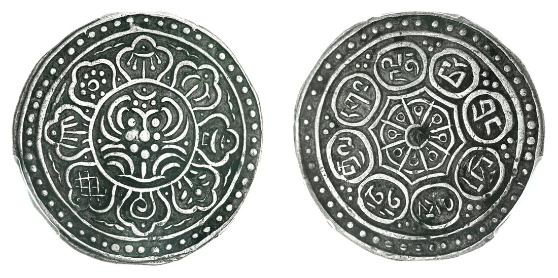 PCGS XF45 | Tibetan Government, Anonymous, Gaden Tangka, Class D, c. 1896-1899, three dots between petals, rev. with spokes, three dots between petals, (LM 630; Rhodes Dii; Y D13.2), touch of softness in parts, otherwise a pleasingly bold strike, toned, extremely fine, in PCGS holder, graded XF45 (Cert. #48254108); Tibetan Government, Anonymous, Gaden Tangka, Class E, c. 1899-1907, waved line between petals, rev. with spokes, three dots between petals, (Rhodes Ei), damage to the reverse at centre and resultingly on a lightly waved flan, otherwise a pleasingly bold strike, bolder very fine, in PCGS holder, graded PCGS Genuine ~ Damage XF DETAIL (Cert. #195584.98/48254107), incorrectly identified by PCGS as Rhodes Type Dii (2)