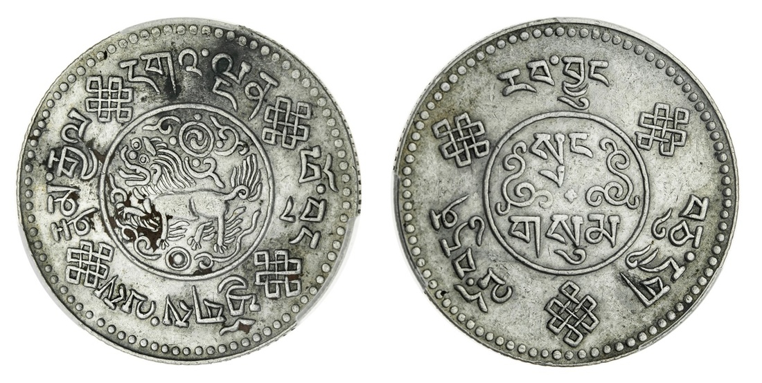 Tibetan Government, Anonymous, First Issue, 3-Srang, 16-7 (1933), Trabshi mint, snow lion facing left, rev. denomination in two lines, flanked by ornaments and a small cross, milled edge, 11h (cf. Rhodes 2013, lot 369; LM 659; Y 25), with red deposits to the obverse and minor marking to the fields, otherwise nearing extremely fine, in PCGS holder, graded PCGS Genuine ~ Environmental Damage XF DETAIL (Cert. #48254098)