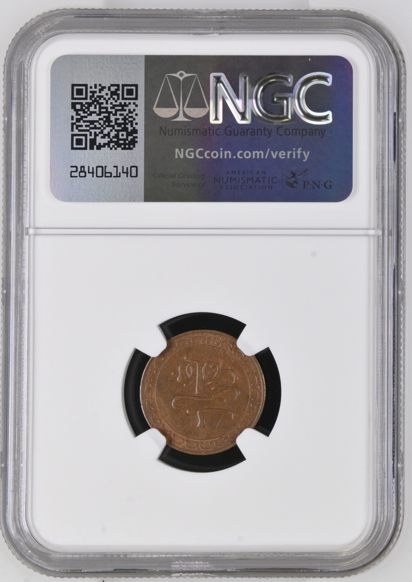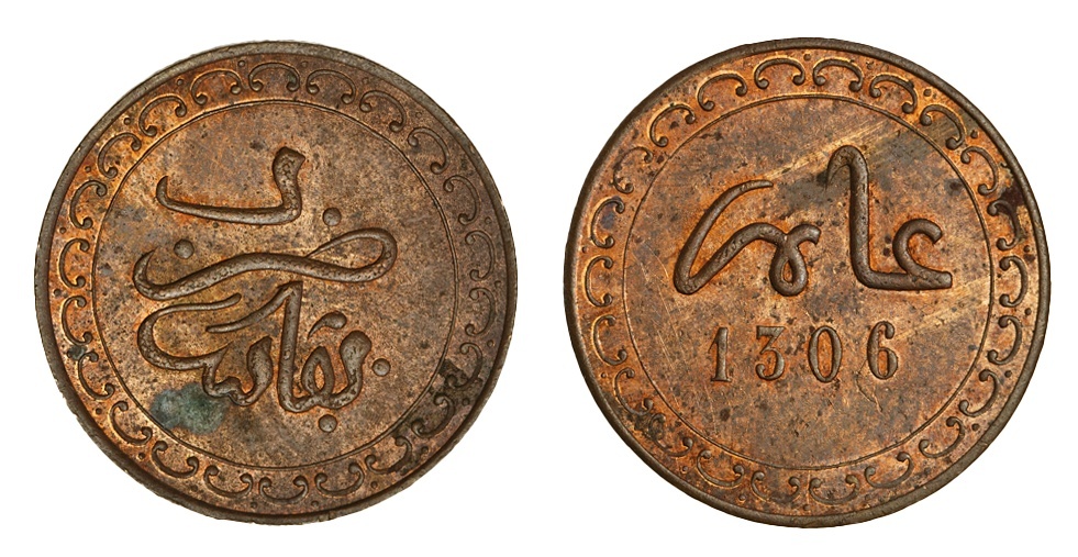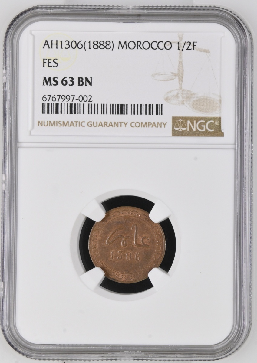 NGC MS63 BN | Morocco, Moulay Al-Hasan I (1873-1894), Half-Falus, AH 1306 (1888/9), plain edge, 6h, 1.44g (Lec 14; KM YB1), minor contact marking and deposit to the reverse, otherwise with a flashy mint red beneath lightly carbonised surfaces, extremely fine, scarce, in NGC holder, graded MS63 BN (Cert. #6767997-002)
