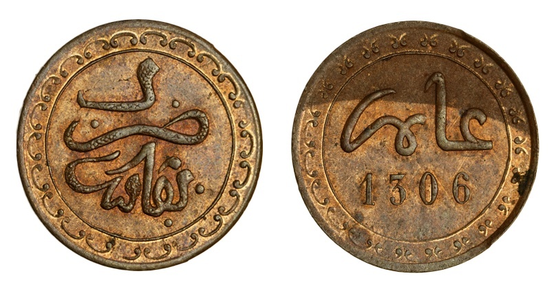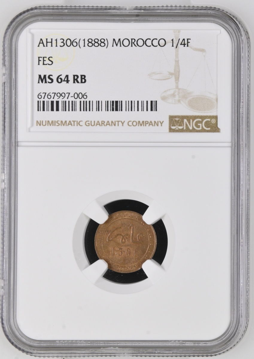 NGC MS64 BN | Morocco, Moulay Al-Hasan I (1873-1894), Quarter-Falus, AH 1306 (1888/9), plain edge, 6h, 0.72g (KM YC1), minor friction marking, elliptical area of toning to the reverse to otherwise mint red and flashy surfaces, good extremely fine, scarce, in NGC holder, graded MS64 BN (Cert. #6767997-006)
