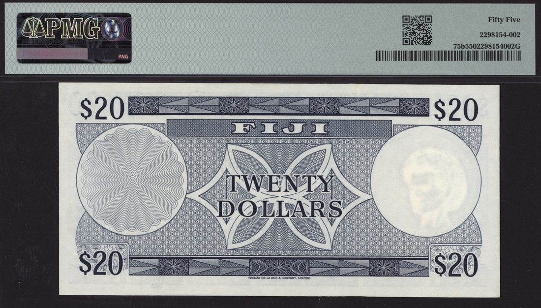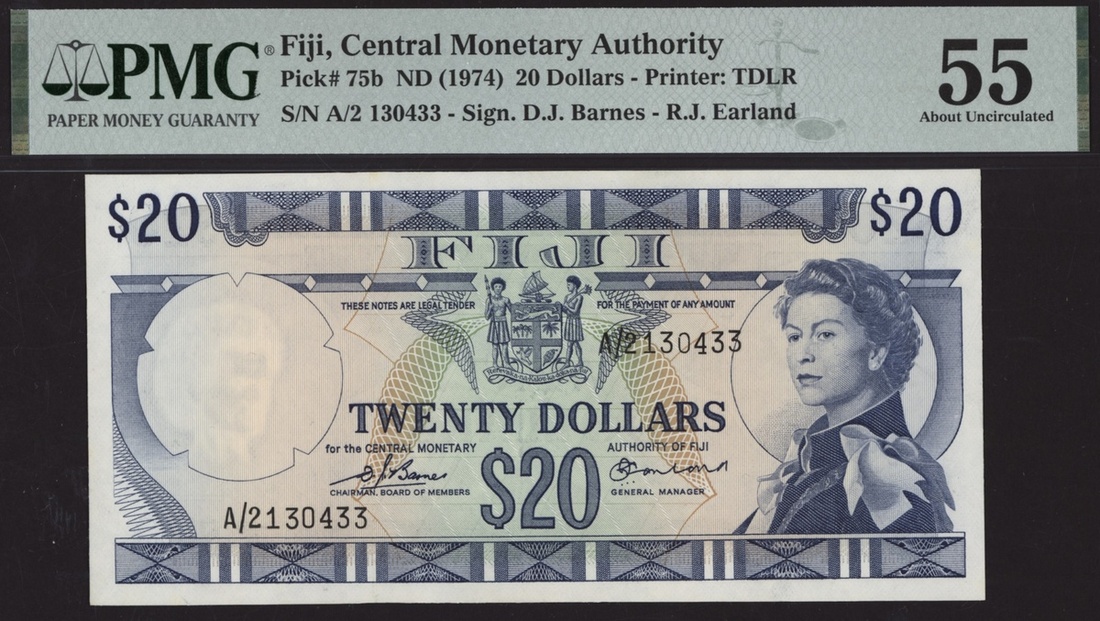 (x) Central Monetary Authority, Fiji, 20 Dollars, ND (1974), serial number A/2 130433, (Pick 75b, BNB 406), in PMG holder 55 About Uncirculated