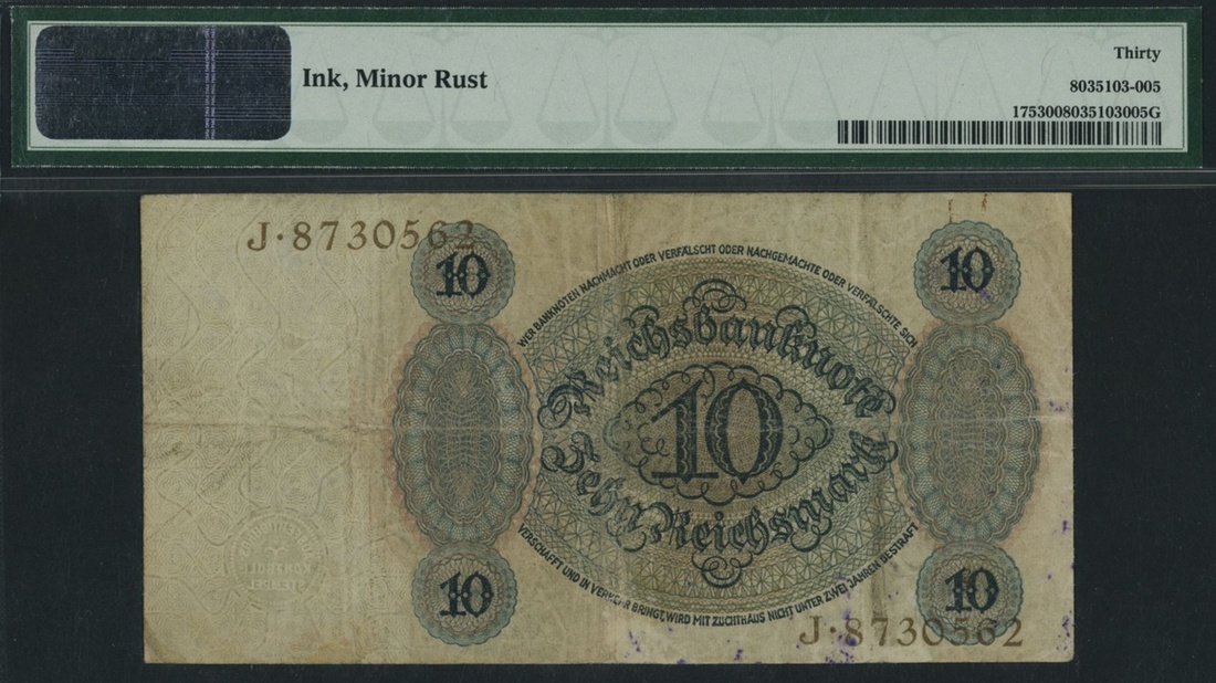 (x) Germany, Reichsbanknote, 10 Reichsmark, 11th October 1924, red serial number J 8730562, obverse, dark green and red-lilac, portrait of man at upper right, reverse, multicolour, serial number in gold colour