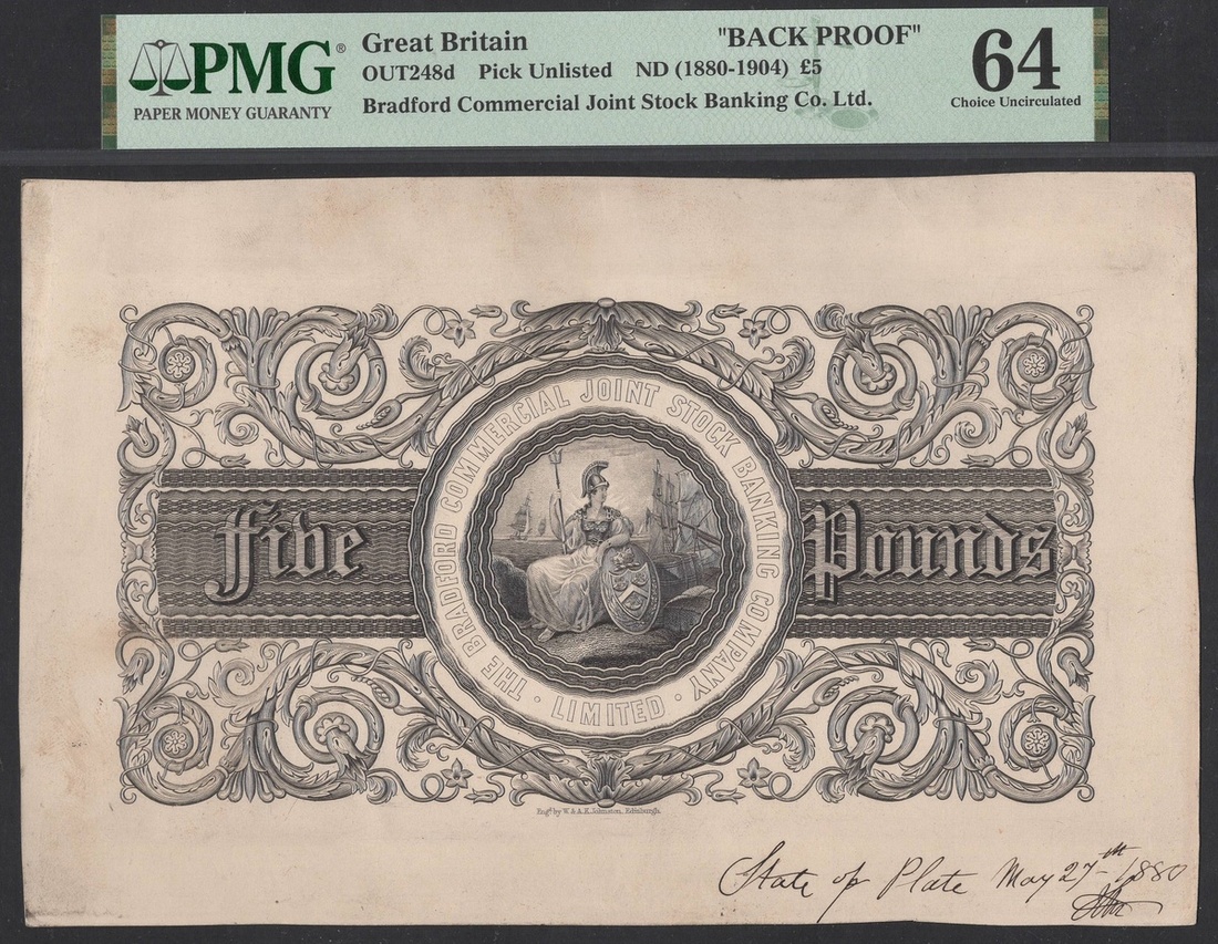 (x) Bradford Commercial Join Stock Banking Co, Ltd., Great Britain, [Top Pop] Back Proof £5, ND (1880-1904), (Outing 248d), in PMG holder 64 Choice Uncirculated, tied for finest graded with just another note on PMG Census