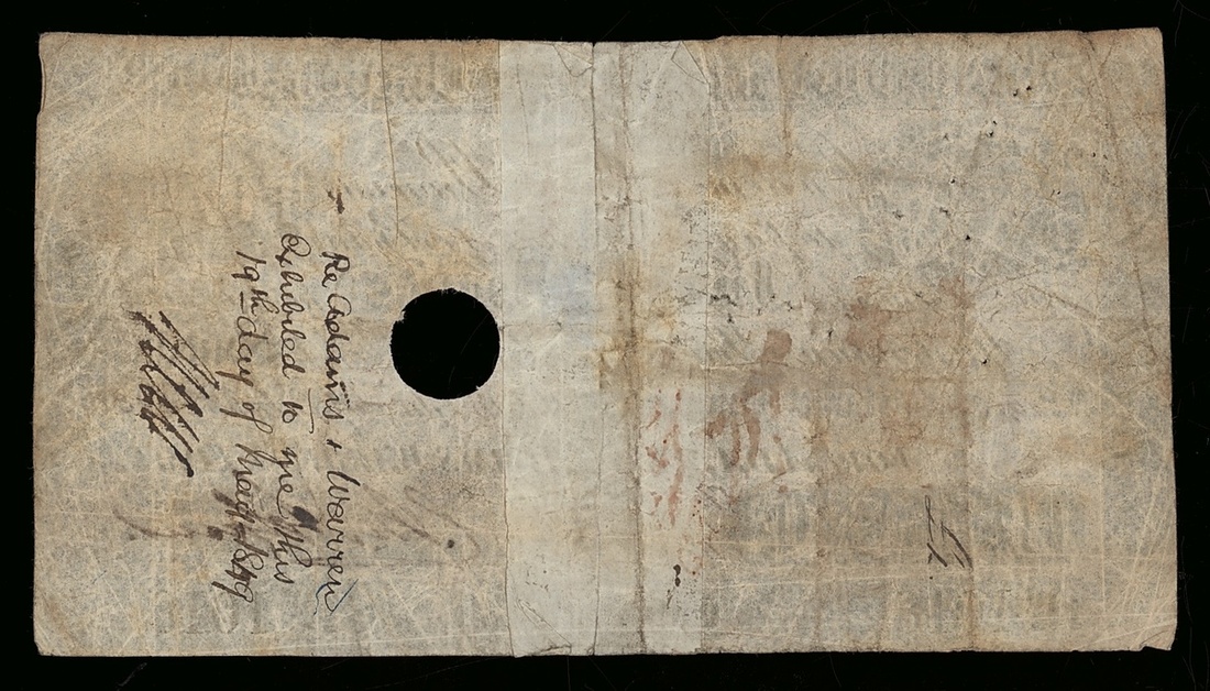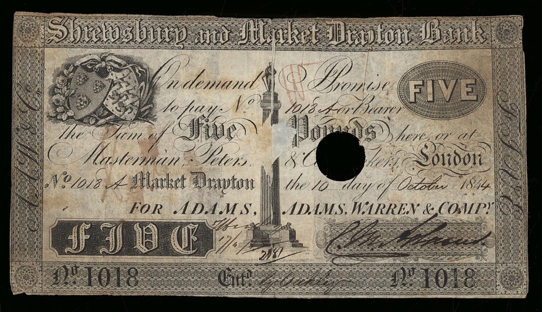 Shrewsbury and Market Drayton Bank, £5, 10th October 1844, serial number 1018, punch cancelled;