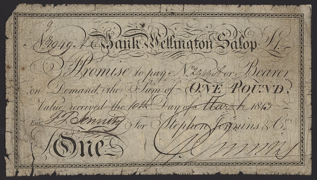Bank Wellington Salop, £1, 10th March 1813, serial number 2949;