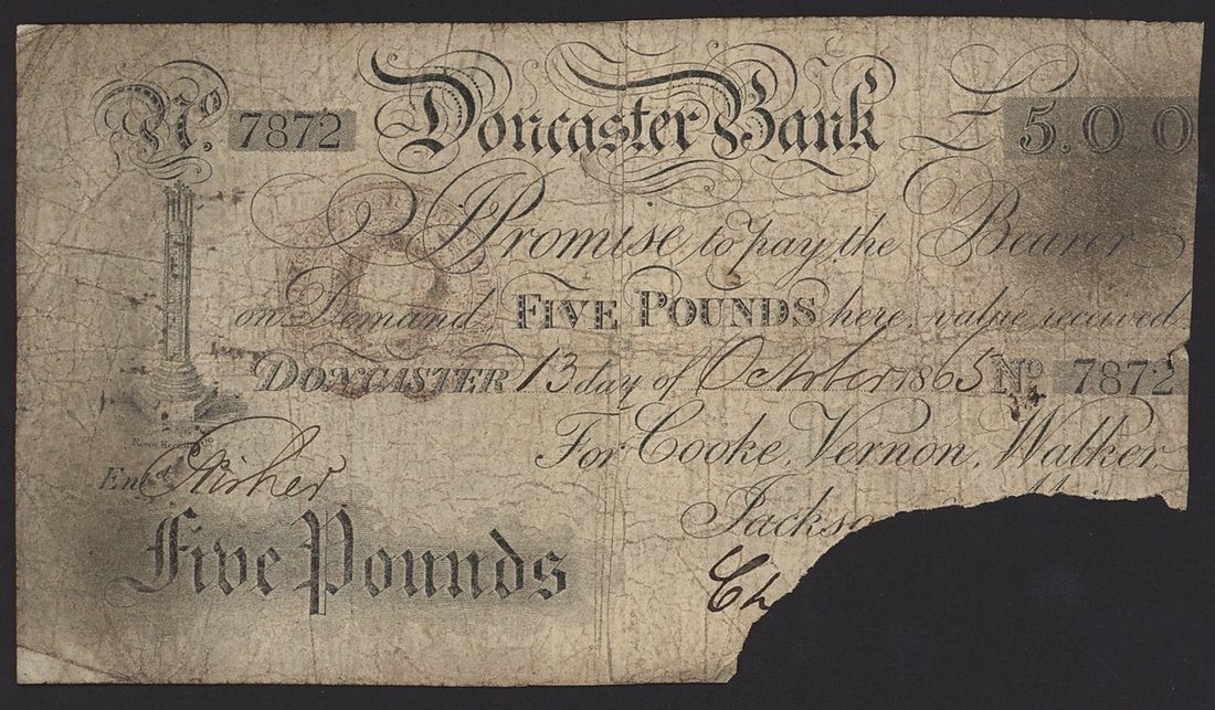 Doncaster Bank, £5, Doncaster, 13th October 1865, serial number 7872, (Outing 698e for type, but cut cancelled instead of punch cancelled), good, tape repairs, cut cancelled