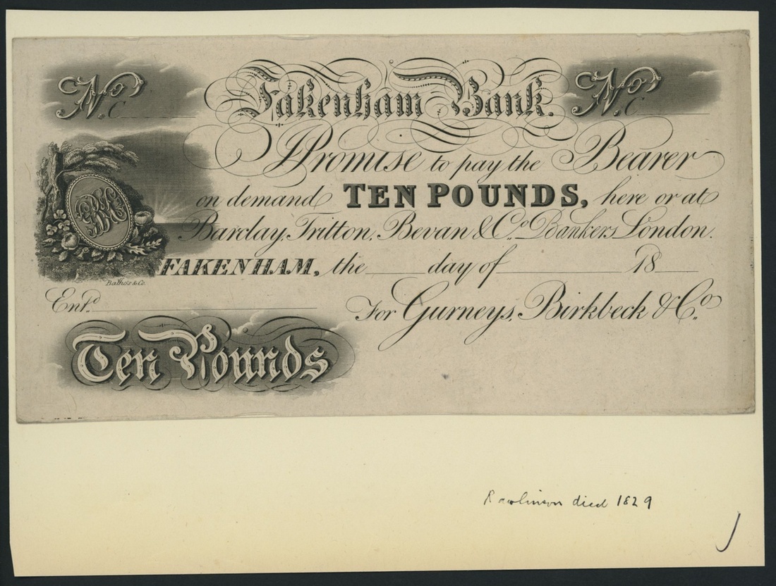 Fakenham Bank, obverse proof on card £10, 18xx (ND 1887-1896), for Gurneys, Birkbeck & Co.
