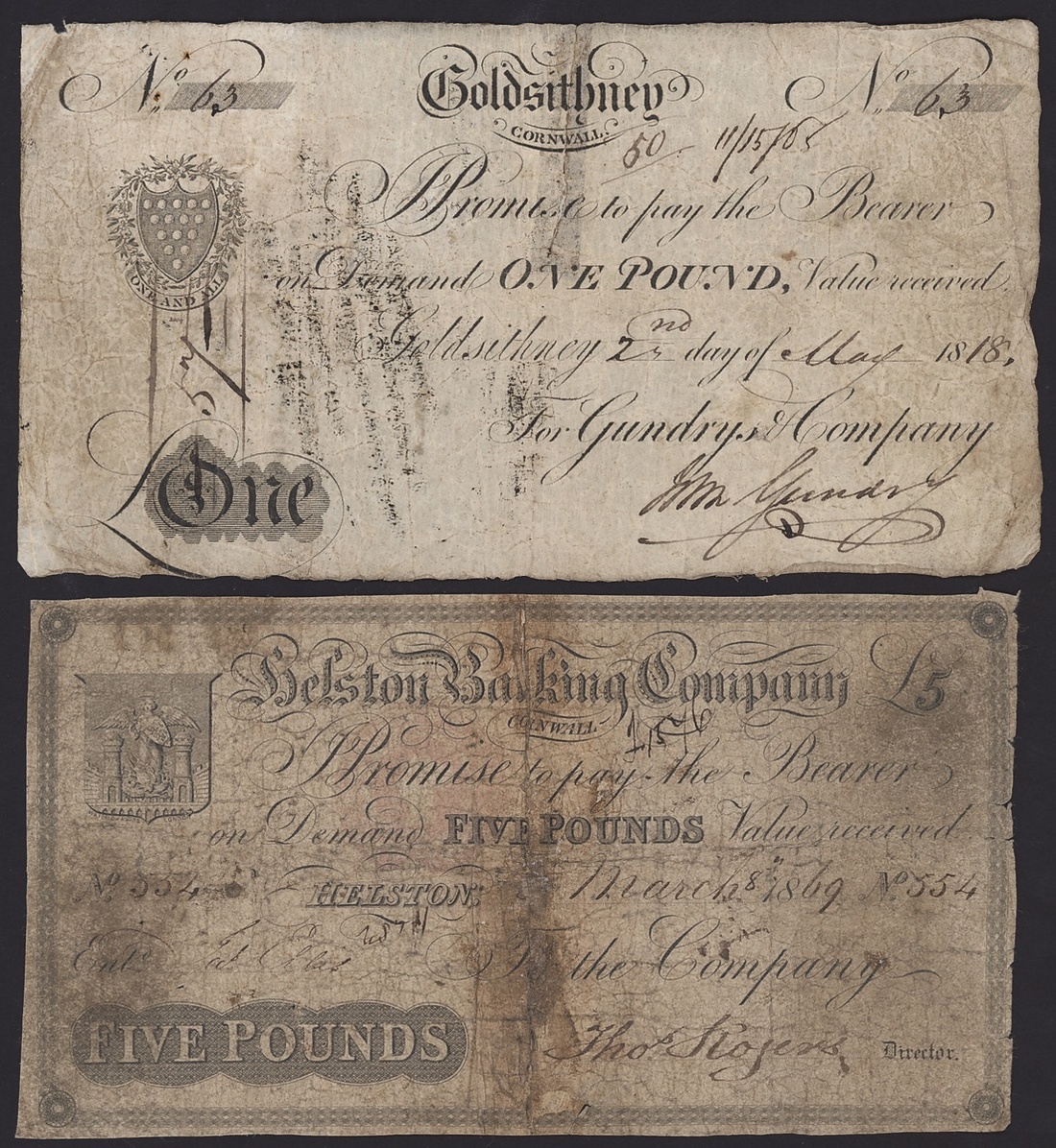 Goldsithney, Helston Banking Company, Cornwall, [2 notes] £1, £5, 1818-69, £1, Goldsithney, 2nd May 1818, serial number 63;