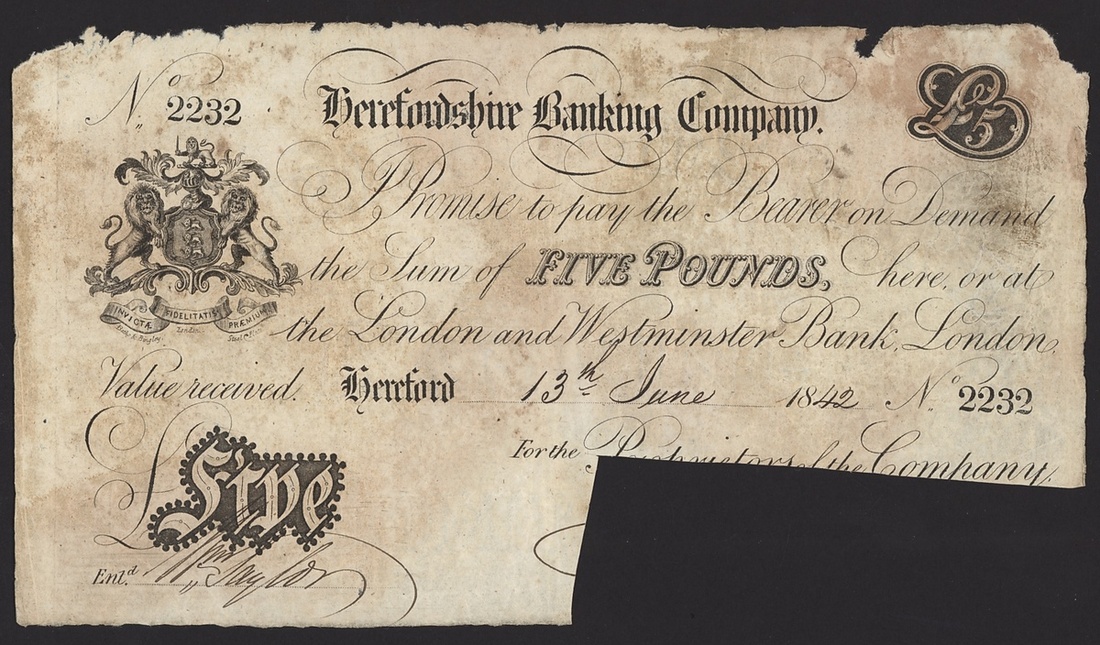 Herefordshire Banking Company, £5, Hereford, 13th June 1842, serial number 2232, cut cancelled