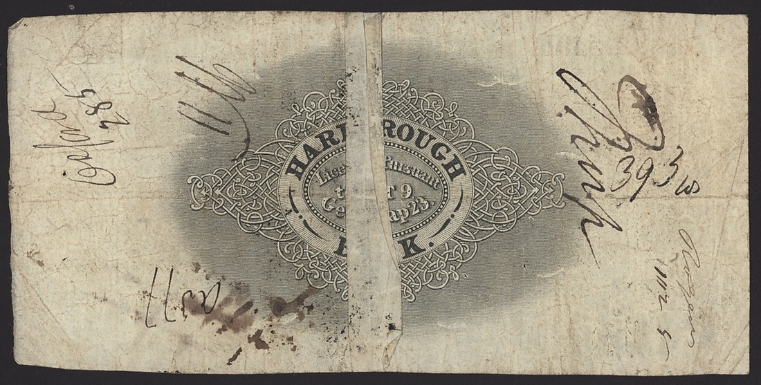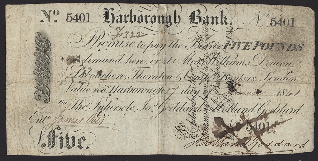Harborough Bank, £5, Harborough, 17th March 1841, serial number 5401, (Outing 1397g), good, pinholes and tape repaired, ink cancelled