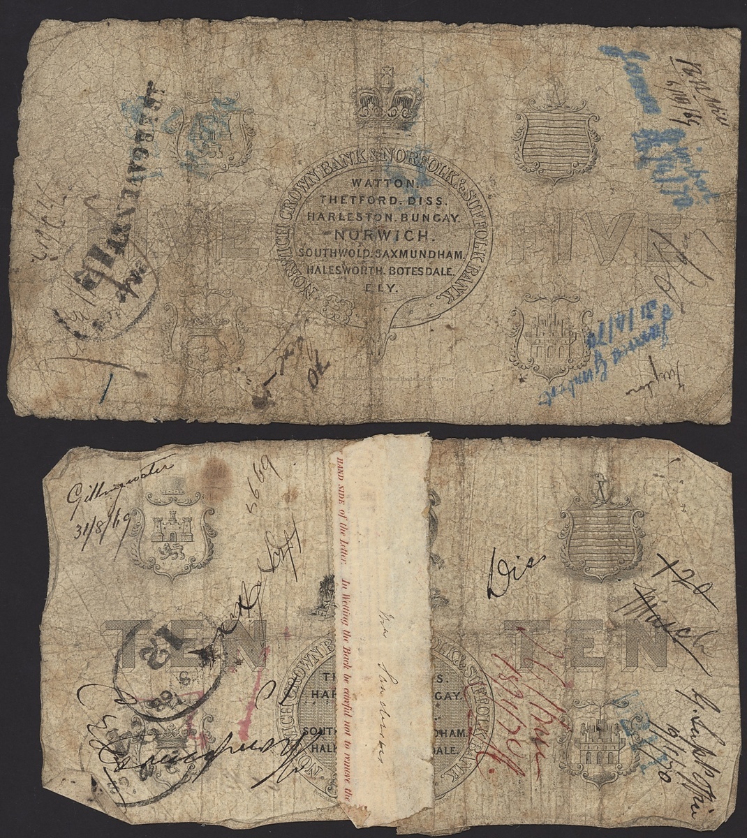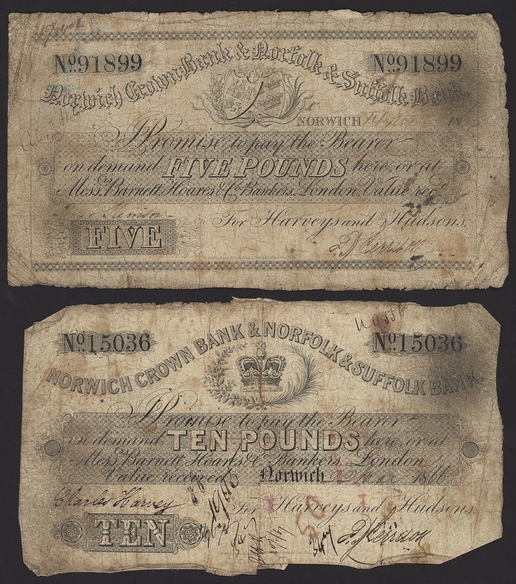Norwich Provincial Notes, [3 notes] £1, £5, £10, 1823-66, Norwich Crown Bank and Norfolk and Suffolk Bank (2): £5, 14th January? 1865, serial number 91899; £10, 22nd March 1866, serial number 15036;