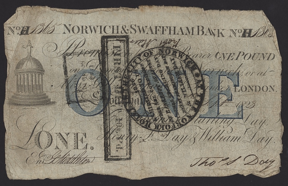 Norwich and Swaffham Bank, £1 with blue 'ONE' on obverse, day illegible, September 1823, serial number 1365