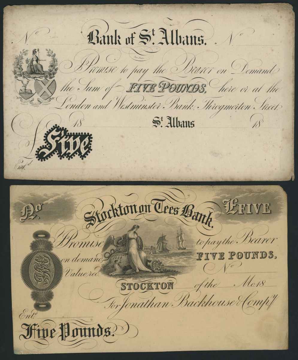 Bank of St. Albans, Stockton on Tees Bank, Western District Banking Company, Trio of £5 proofs,