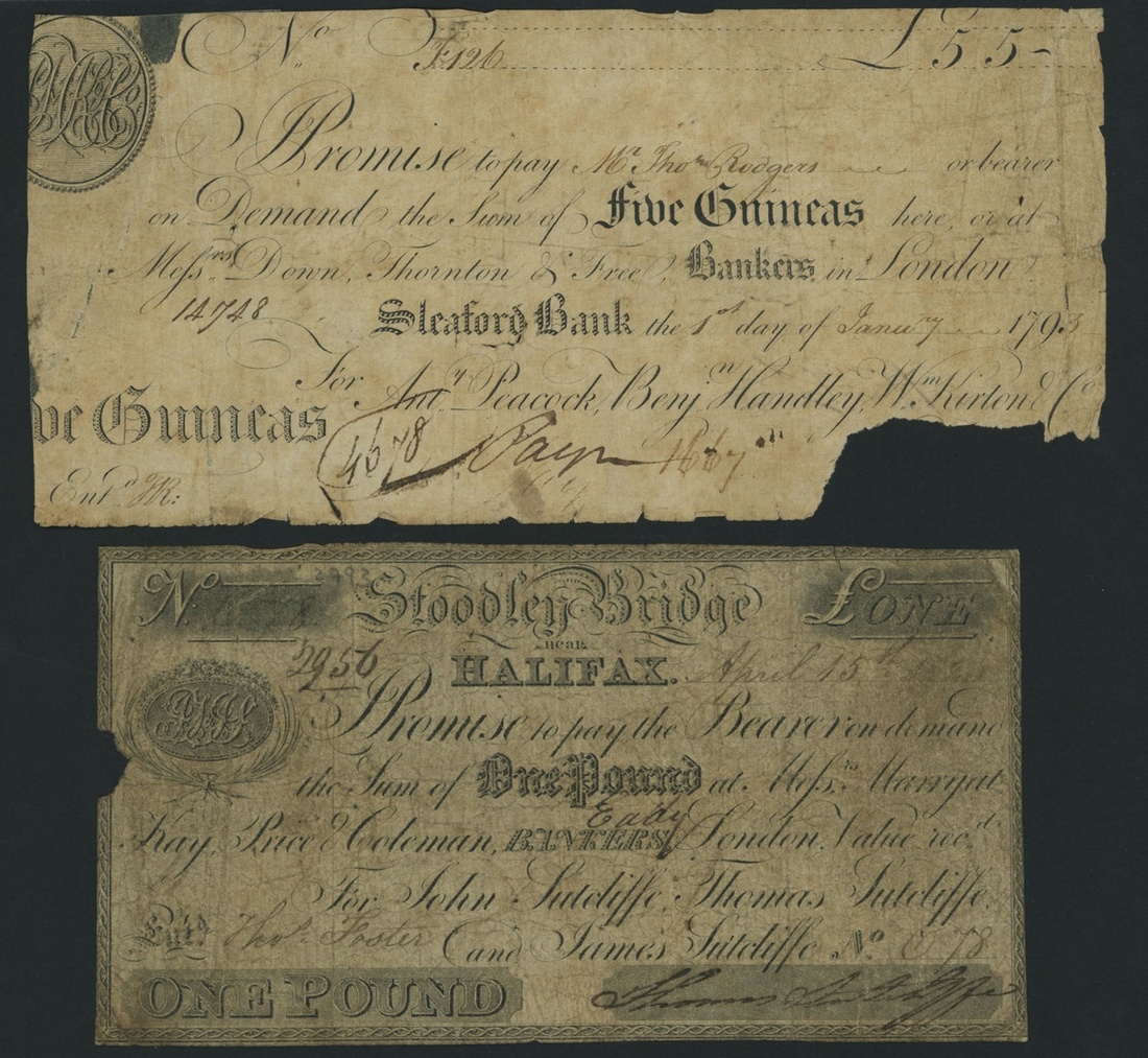 Yorkshire Provincial Banknotes, [4 notes] 5 Guineas, £1, £5, 1793-1842, Halifax, Stoodley Bridge, £1, 15th April 18-- illegible, serial number 78