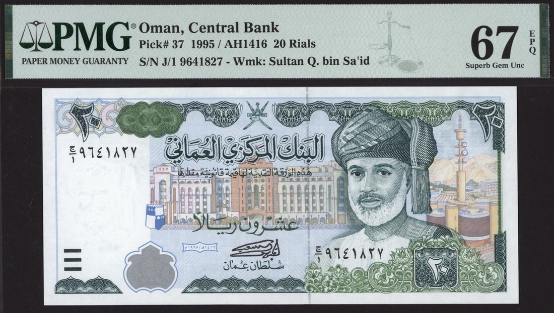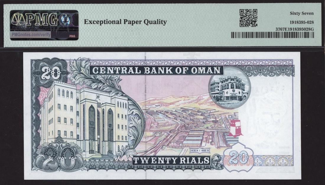 (x) Central Bank of Oman, 20 Rials, 1995 / AH1416, serial number J/1 9641827, (Pick 37 BNB 225a), in PMG holder 67 EPQ Superb Gem Uncirculated, only 3 notes in higher grade on PMG Census
