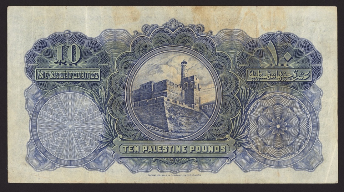 the splendid design of this 10 Palestine Pounds banknote displays vivid notes of blue and green, along with Arabic, Hebrew and English text. On the obverse of this note, an image of the Crusader's Tower in Ramleh is featured, whilst a circular image of the Tower of David (Migdal David) citadel in Jerusalem appears on the reverse. The denomination of this note is exhibited on both sides within the guilloches. In addition to the serial number, a watermark of an olive sprig further authenticates this note,