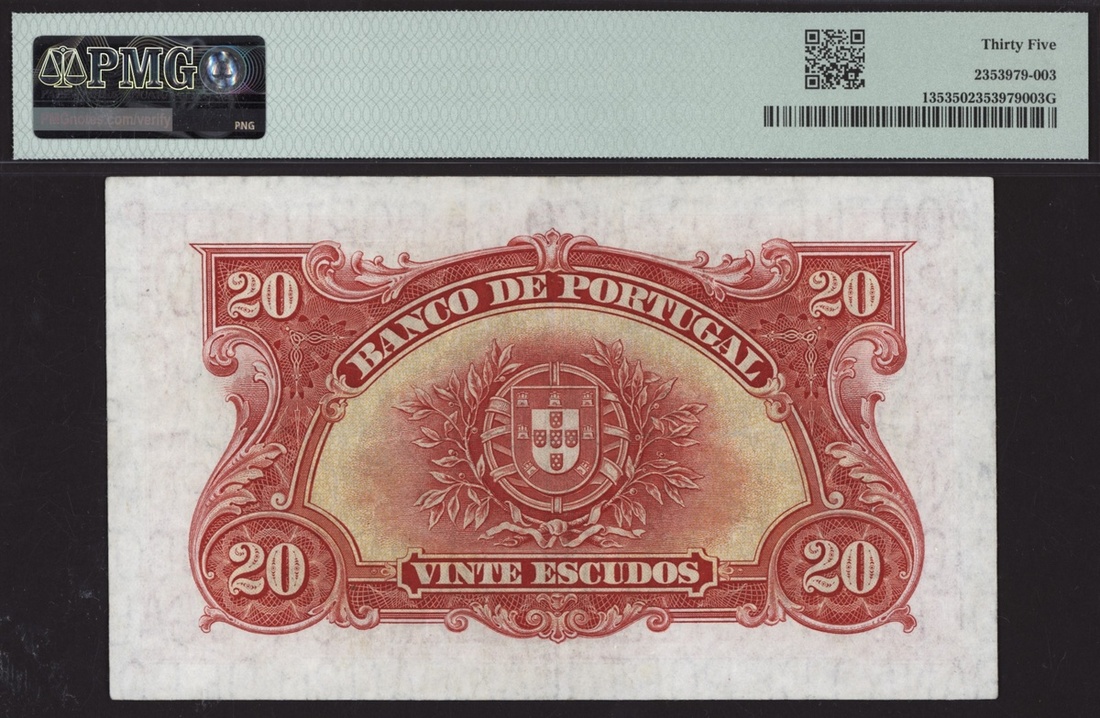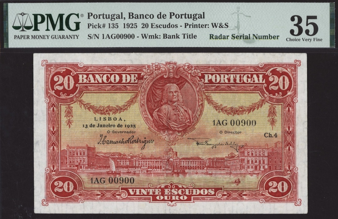(x) Banco de Portugal, 20 Escudos, 13 de Janeiro 1925, Radar serial number 1AG 00900, (Pick 135), in PMG holder 35 Choice Very Fine, only 4 notes in higher grade on PMG Census