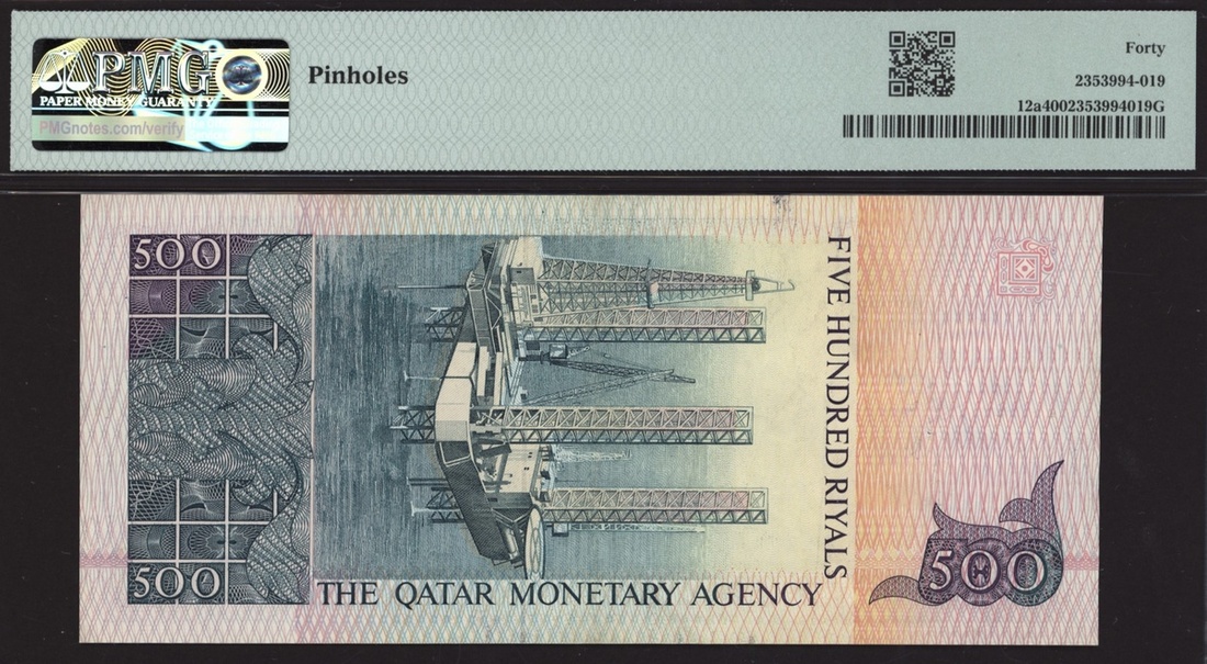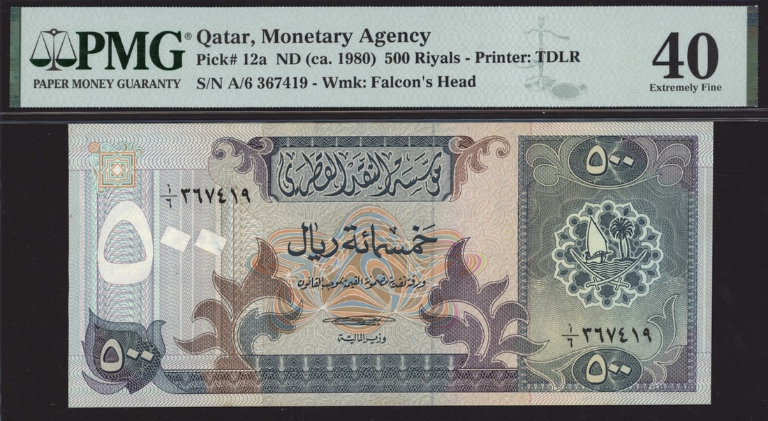 (x) Monetary Agency, Qatar, 500 Riyals, ND (ca. 1980), serial number A/6 367419, (Pick 12a, BNB 112a), in PMG 40 Extremely Fine, pinholes