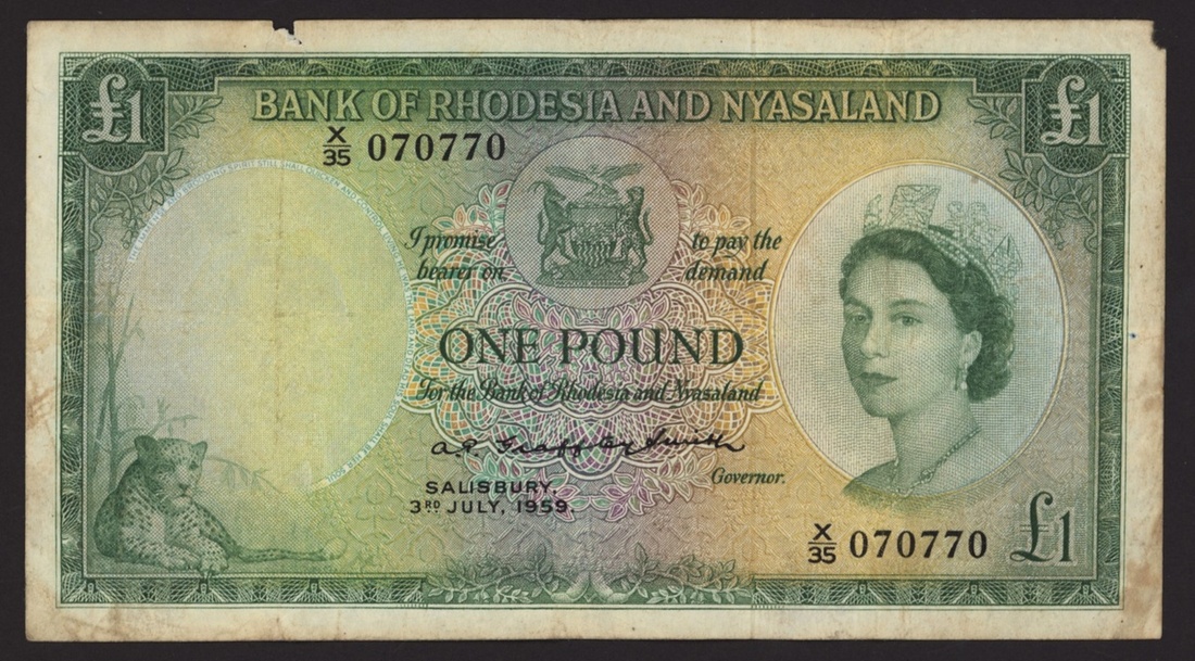 Bank of Rhodesia and Nyasaland, £1, Salisbury, 3rd July 1959, serial number X/35 070770, (Pick 21a, BNB 102), fine, missing margin at upper left and right corner of note