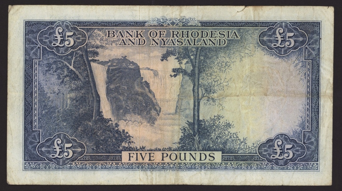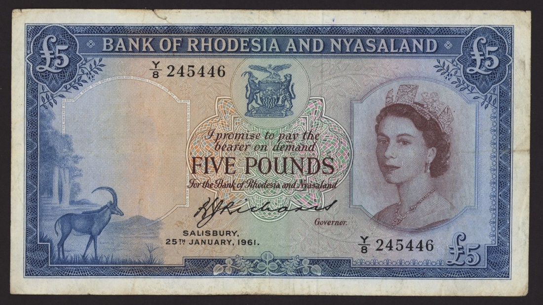 Bank of Rhodesia and Nyasaland, £5, Salisbury, 25th January 1961, serial number Y/8 245446, (Pick 22b, BNB 103), about very fine, splits at upper margin
