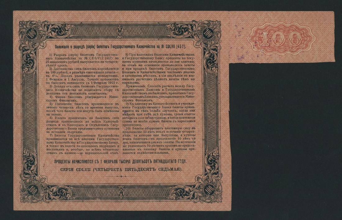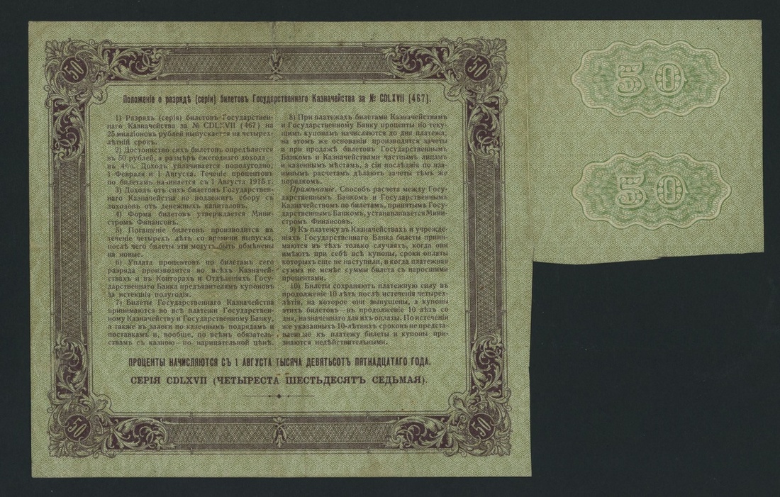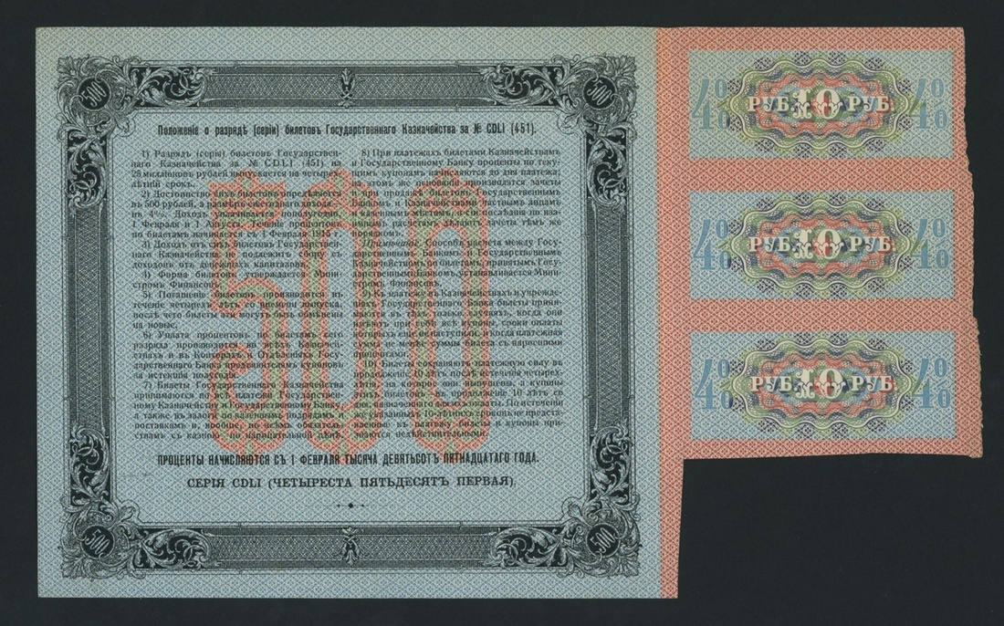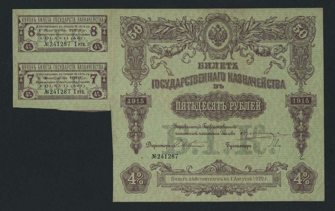 Imperial Bond, Russia, [3 notes] 4% negotiable, 50, 100, 500 Rubles, 1915, serial numbers 187723 and 000968