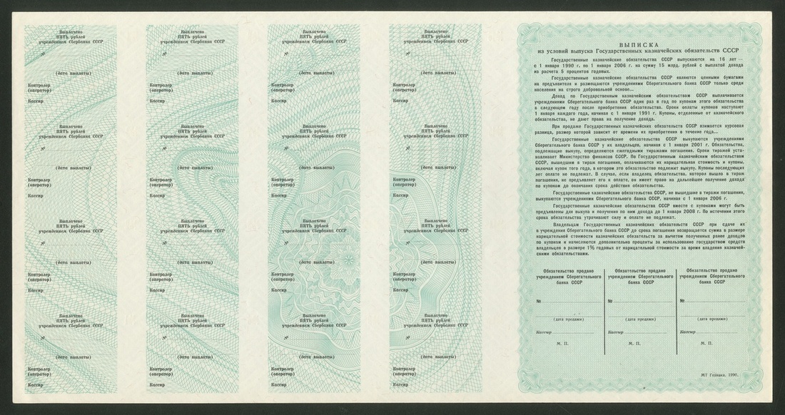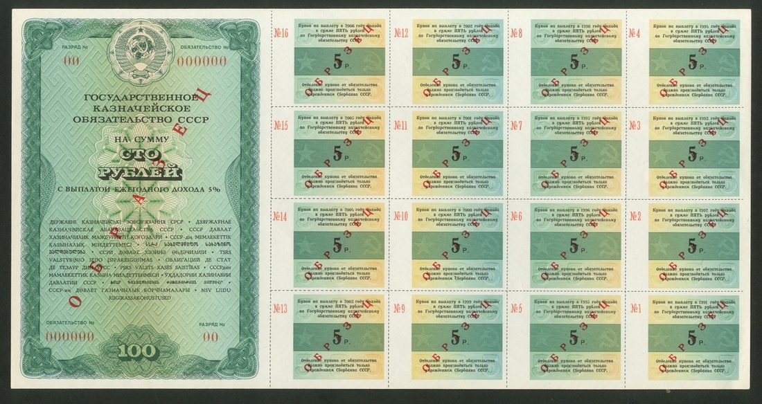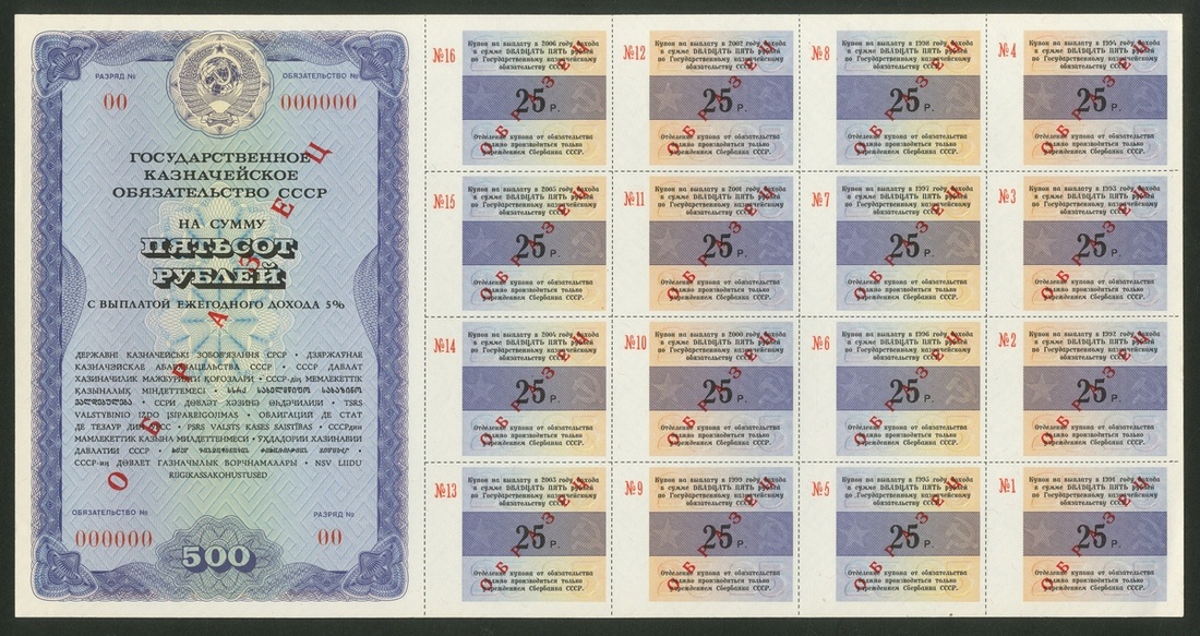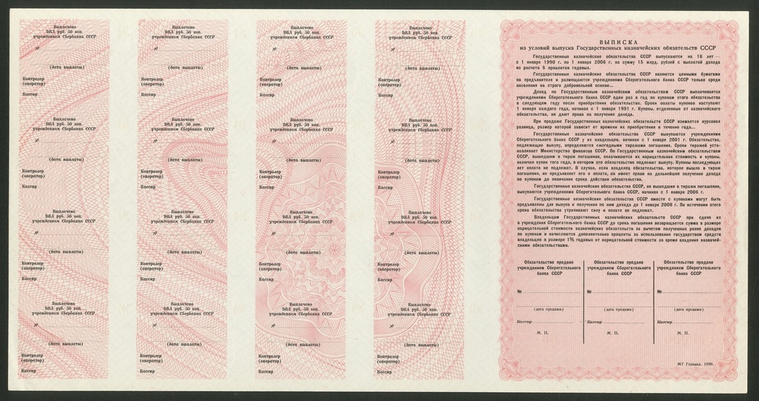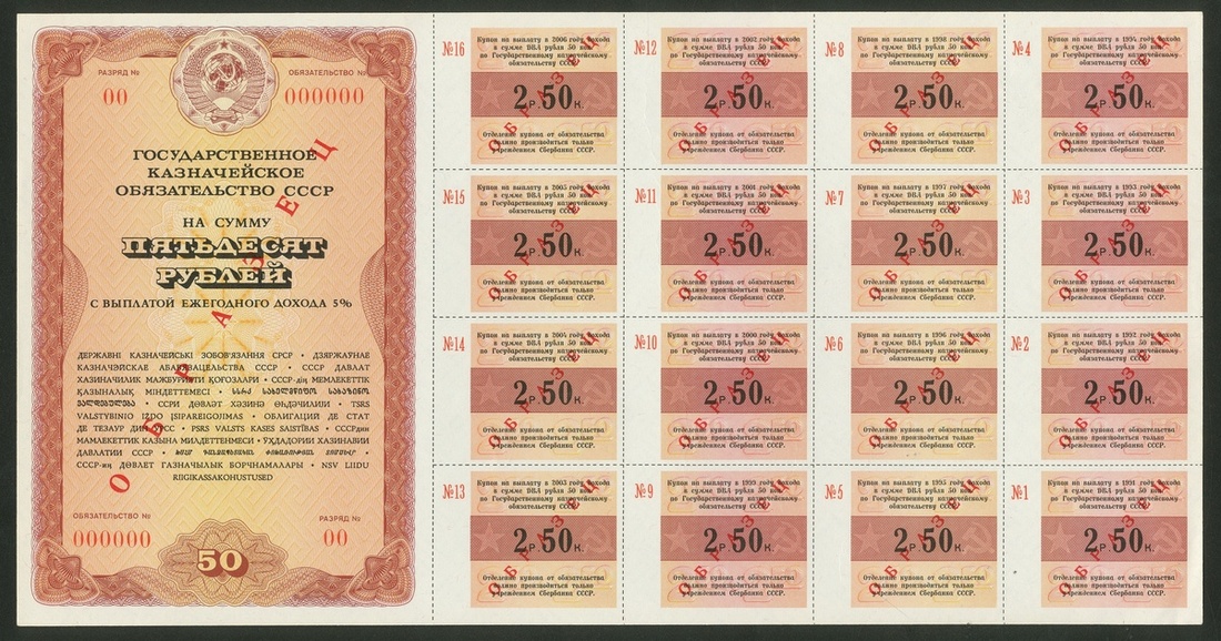 Russia, Soviet State Bond Certificates, [4 notes] specimen 2 Rubles 50 Kopeks, 5, 25, 50 Rubles, 1990, (Pick unlisted), uncirculated, scarce (4 notes), ''Property of a British Gentleman''