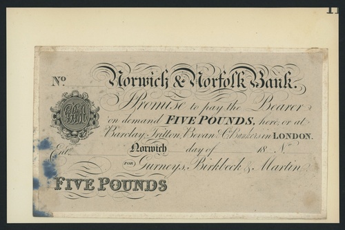 proof £5, Norwich, dated 18--, Gurneys, Birkbeck & Martin are listed circa. 1827 under Outing 1603,