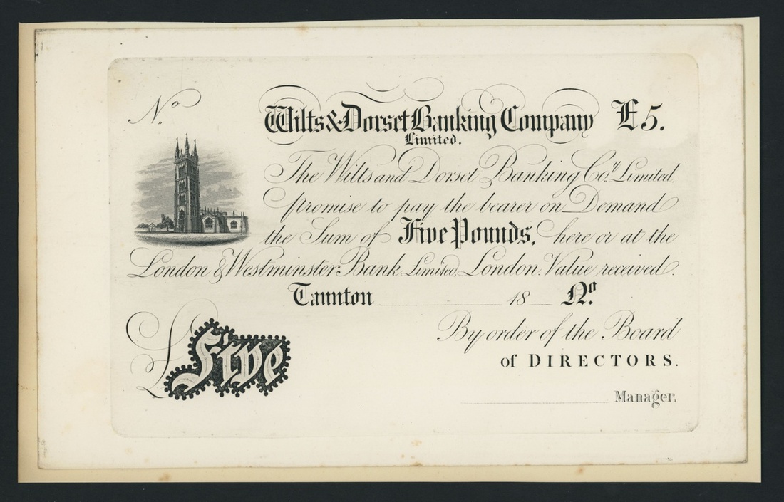 Wilts & Dorset Banking Company Limited, specimen £5, Taunton, dated 18--, the Wilts & Dorset Banking Company Limited circa. 1883-1914