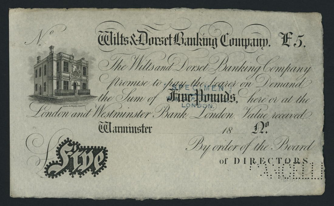 Wilts & Dorset Banking Company, specimen £5, Warminster, dated 18--, perforated 'CANCELLED' and stamped 'SPECIMEN W. W. SPRAGUE', the Wilts & Dorset Banking Co. is listed circa. 1835-1883 is listed under Outing 1890 for Salisbury, which is the Head Office for this bank. This bank is unlisted in Outing in association with Warminster, uniface,