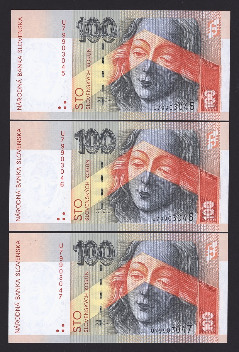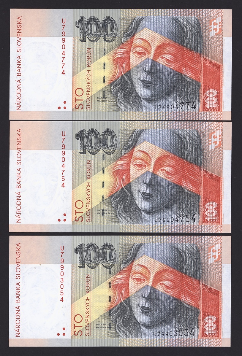 (x) Naronda Banka Slovenska, Slovakia, group of 100 Korun, 2004, consecutive serial numbers U79903045-7, includes serial numbers U79903054, U79904754, U79904774