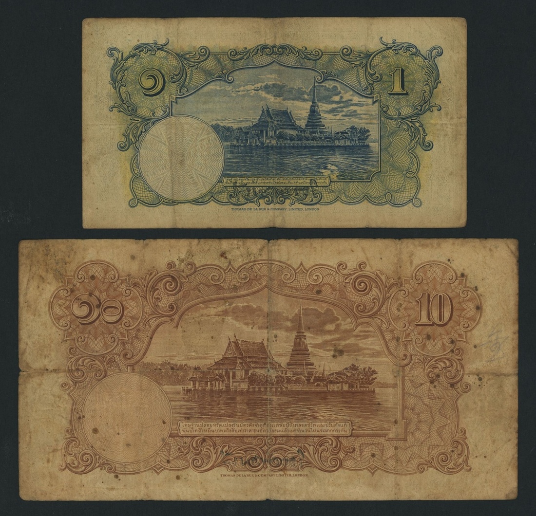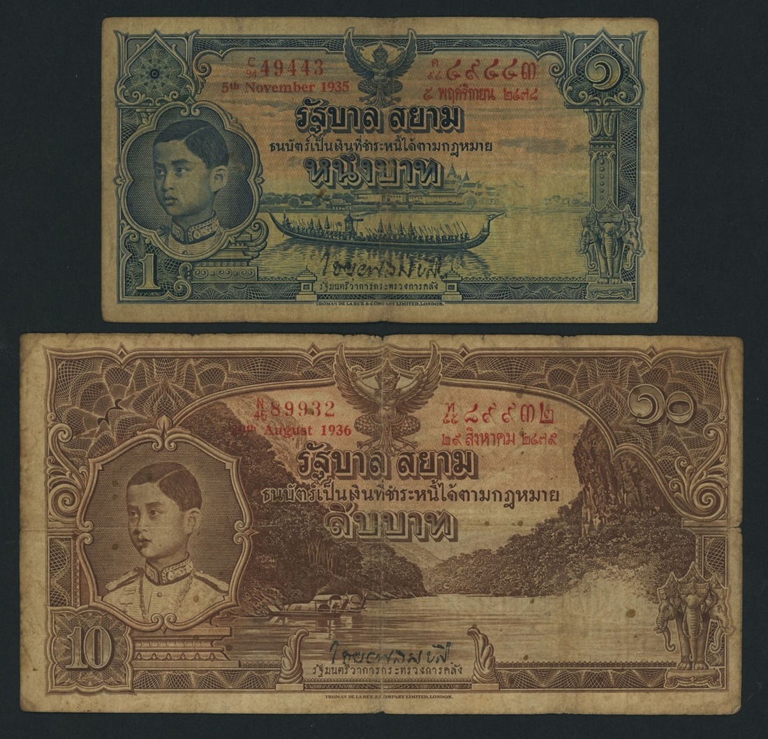 (x) Government of Siam, Thailand, [2 notes], 1, 10 Baht, 1935-1936,