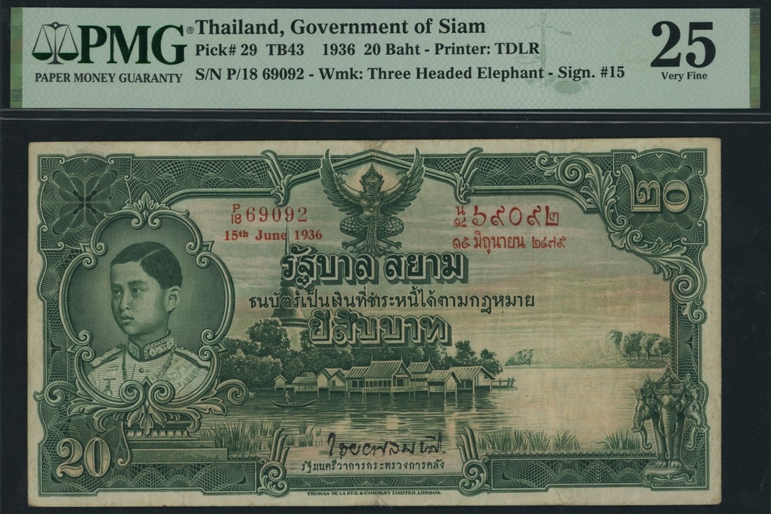 (x) Government of Siam, Thailand, 20 Baht, 15th June 1936, serial number P/18 69092, (Pick 29), in PMG holder 25 Very Fine, annotations