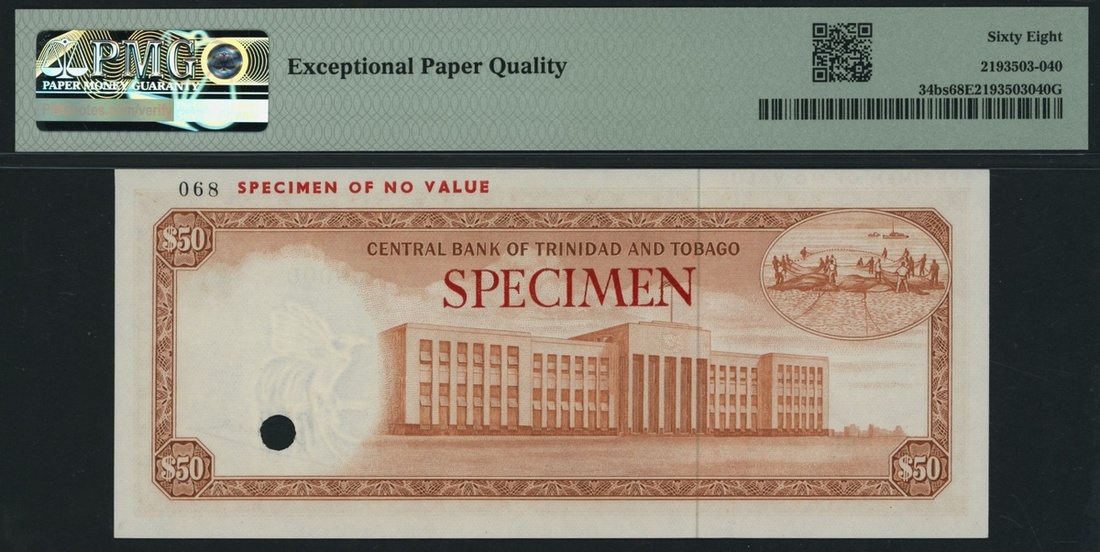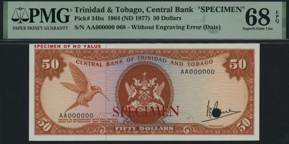 Central Bank of Trinidad & Tobago, specimen $50, 1964 (1977), serial number AA000000 068, (Pick 34bs, BNB 209bs), in PMG holder 68 EPQ Superb Gem Uncirculated
