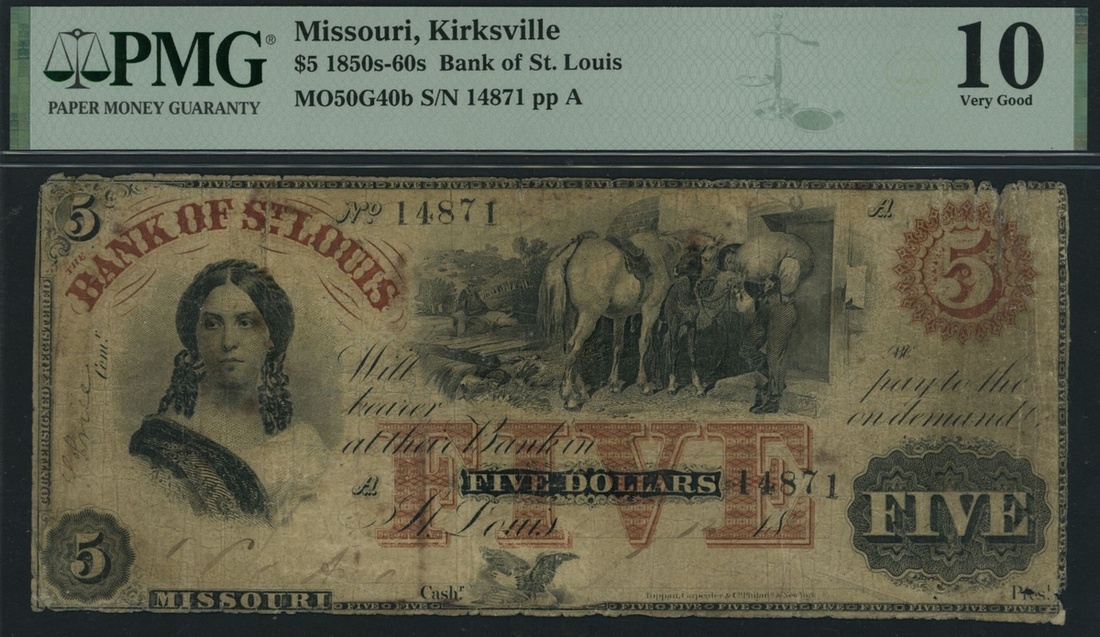 (x) Bank of St. Louis, Kirksville, Missouri, $5, 18xx (1850s-1860s), serial number 14871,