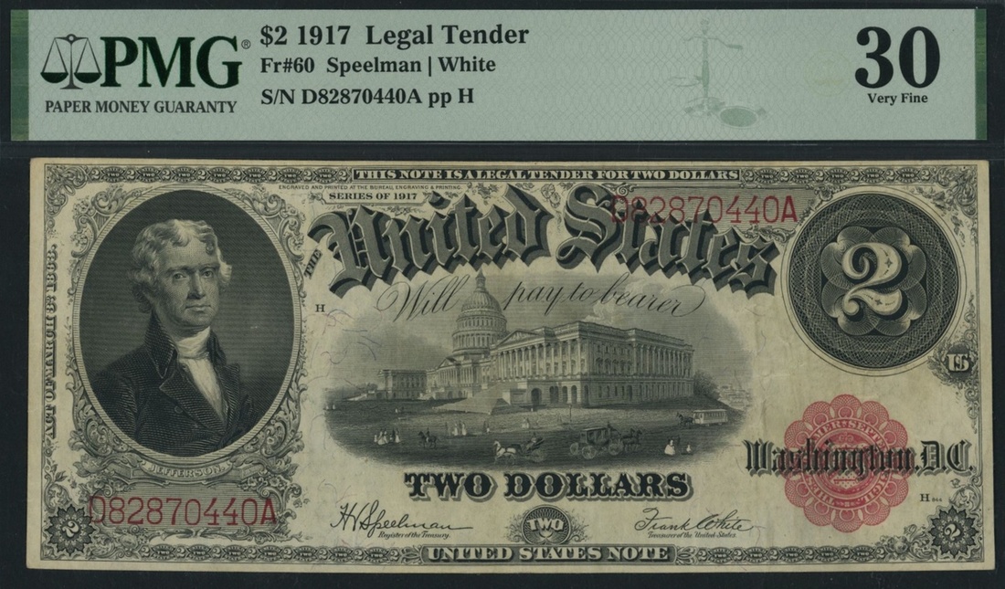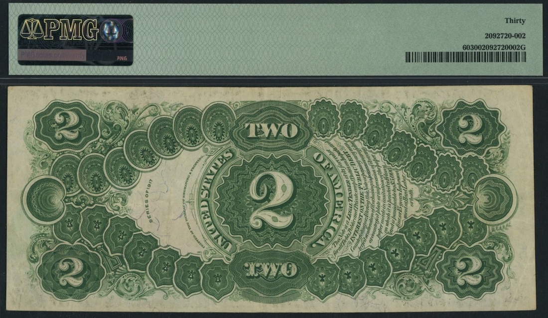 (x) United States of America, $2, Washington DC, 1917, serial number D82870440A, (Fr 60), in PMG holder 30 Very Fine