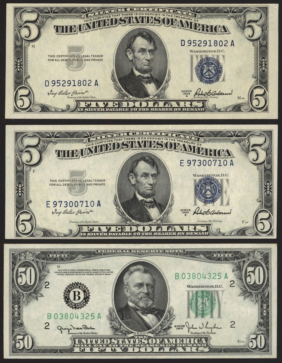 (x) A trio of US notes, including silver certificates $5 (2), series 1953A, also a Federal Reserve $50 1950,