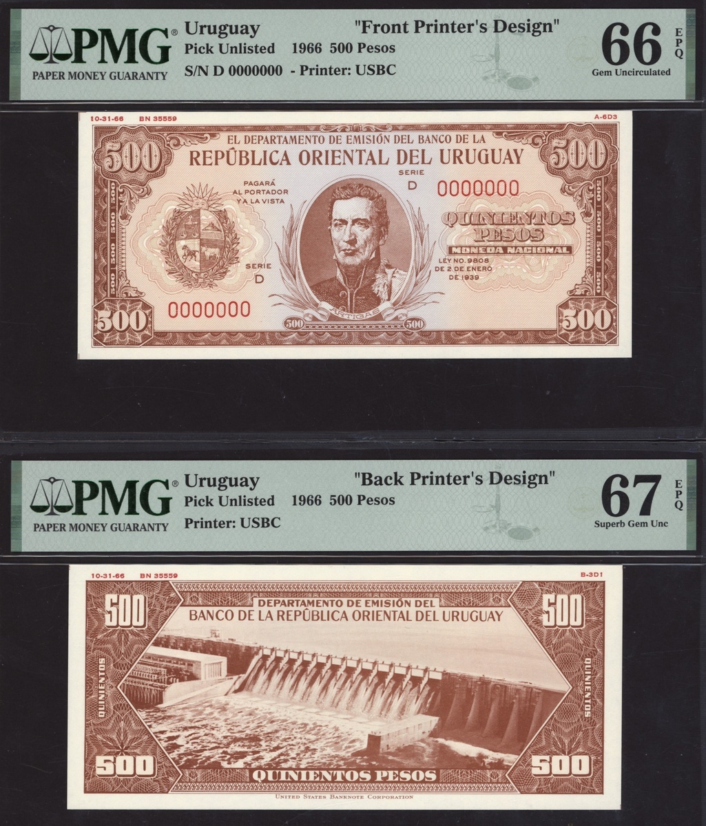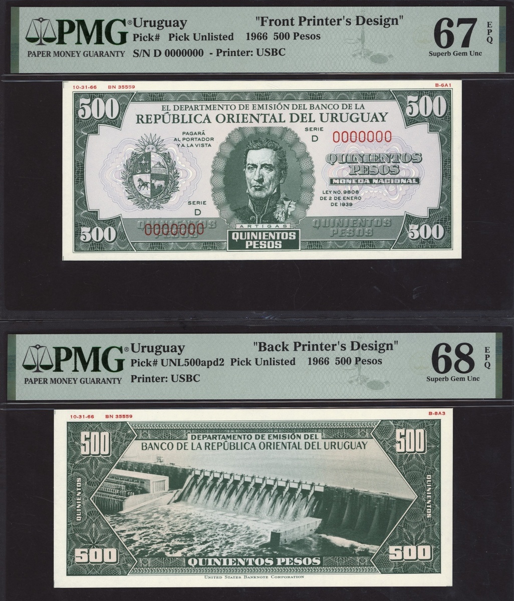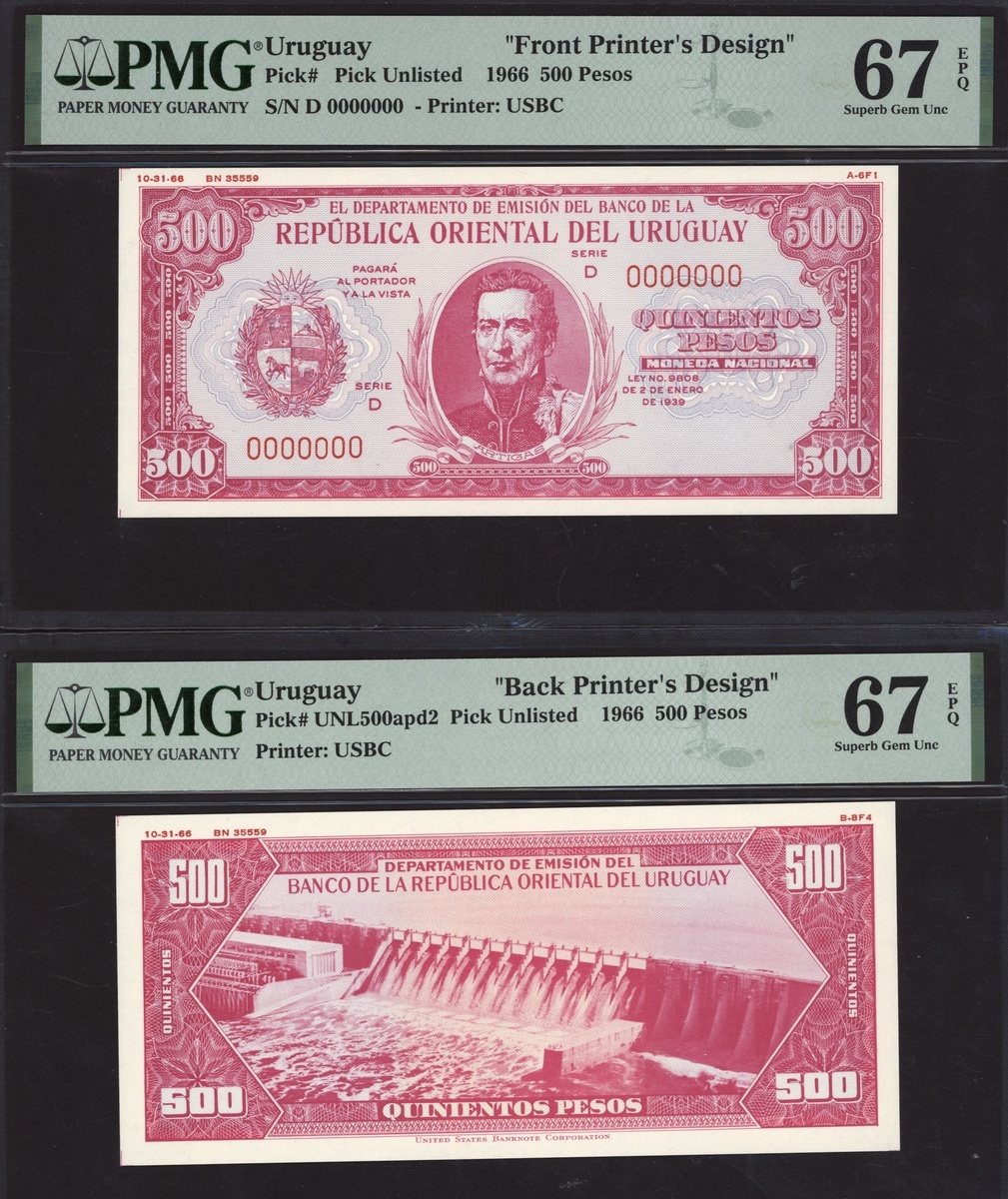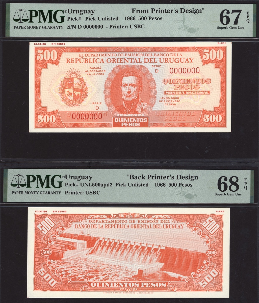 (x) Republica Oriental del Uruguay, [10 notes] Obverse and Reverse Printer's Designs, (Unlisted), all in PMG holders 66 EPQ Gem Uncirculated to 68 EPQ Superb Gem Uncirculated (10 notes)