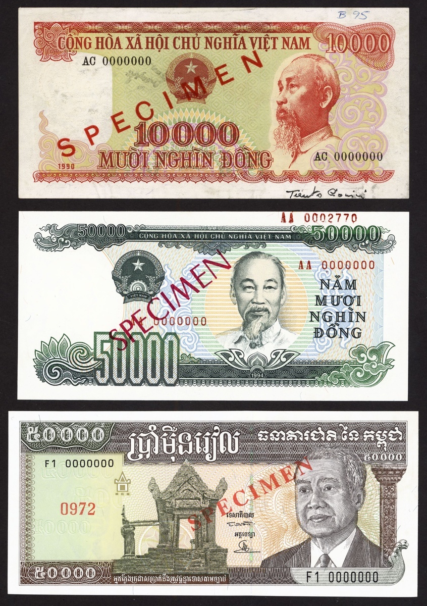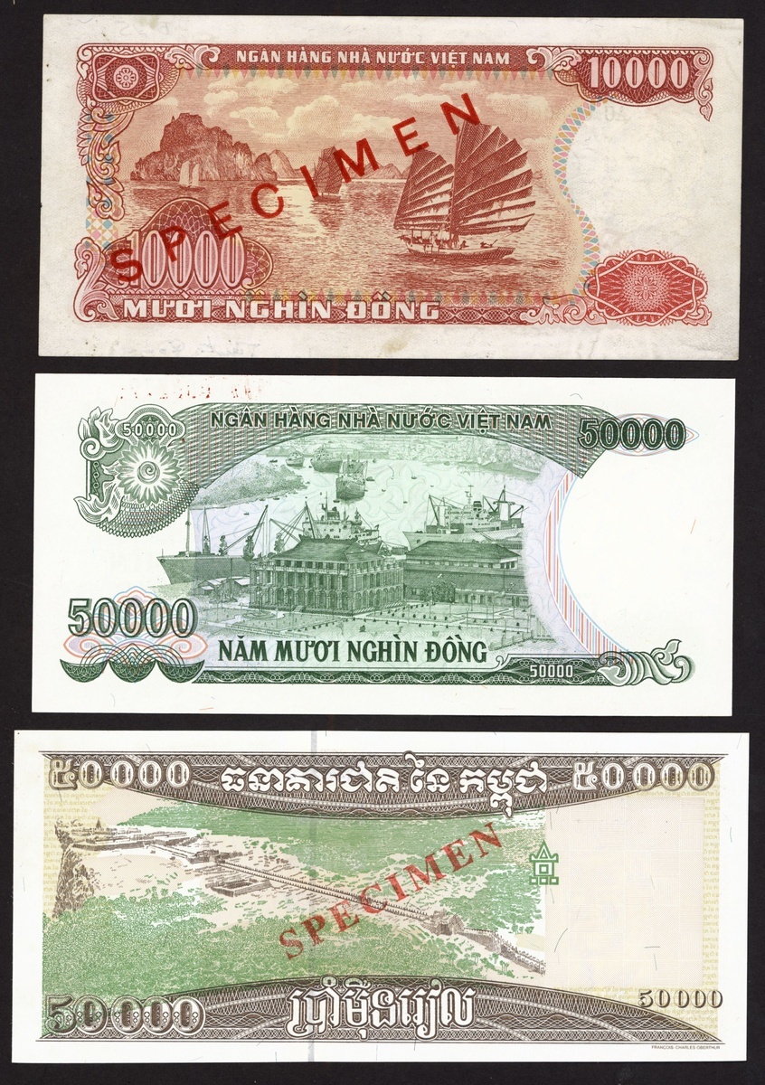 (x) National Bank of Vietnam, specimen 10,000 dong, 1990, also a specimen 50,000 dong, 1994, and Cambodia, specimen 50,000 reis,