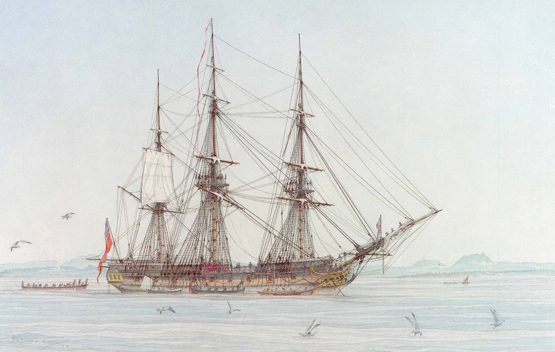 Fully repaired in the Ayala Cove on the northern portion of Angel Island, the Raccoon Strait was named in her honour. Sailing with Naukane, a Hawaiian who had been hired from the North West Company, would serve as interpreter. The intention was to warn off any American ships which were known to winter in Hawaii and impose British interests upon the King. So it was that Black welcomed King Kamehameha I, the first ruler of Hawaii, onto the Raccoon on 18 May 1814. A five gun salute was fired and a gift of cloth, strings of beads, knives and looking glasses were presented. The vessel then had their favour and proceeded to Maui in order to take on provisions. It was an important event, for it was last that the Discovery visited the islands in 1794. Mission complete, they aimed for Lima and more orders.
