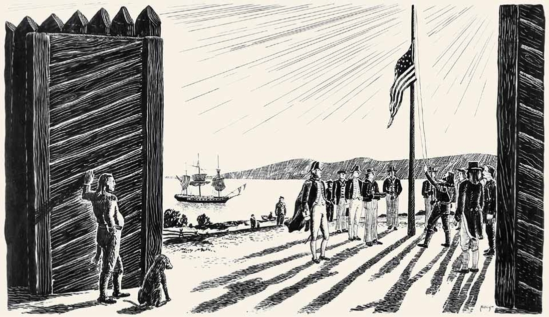 Fort Astoria was the primary trading post of John Jacob Astor's Pacific Fur Company and had been established in 1811. Sat on the Columbia River, the first British vessel to survey this river was the Chatham in 1792. It fell upon Black to take the Raccoon into position, land and take possession of the Fortress for the crown. So it was that he landed on 12 December 1813, to find that the Americans had sold out to the North West Company, a Canadian fur company. Nonetheless, Black claimed the fort and lands around it. They hoisted a Union Jack over the palisades and a bottle of Madeira wine was broken on the flagpole; the station was formally renamed Fort George in honour of King George III.