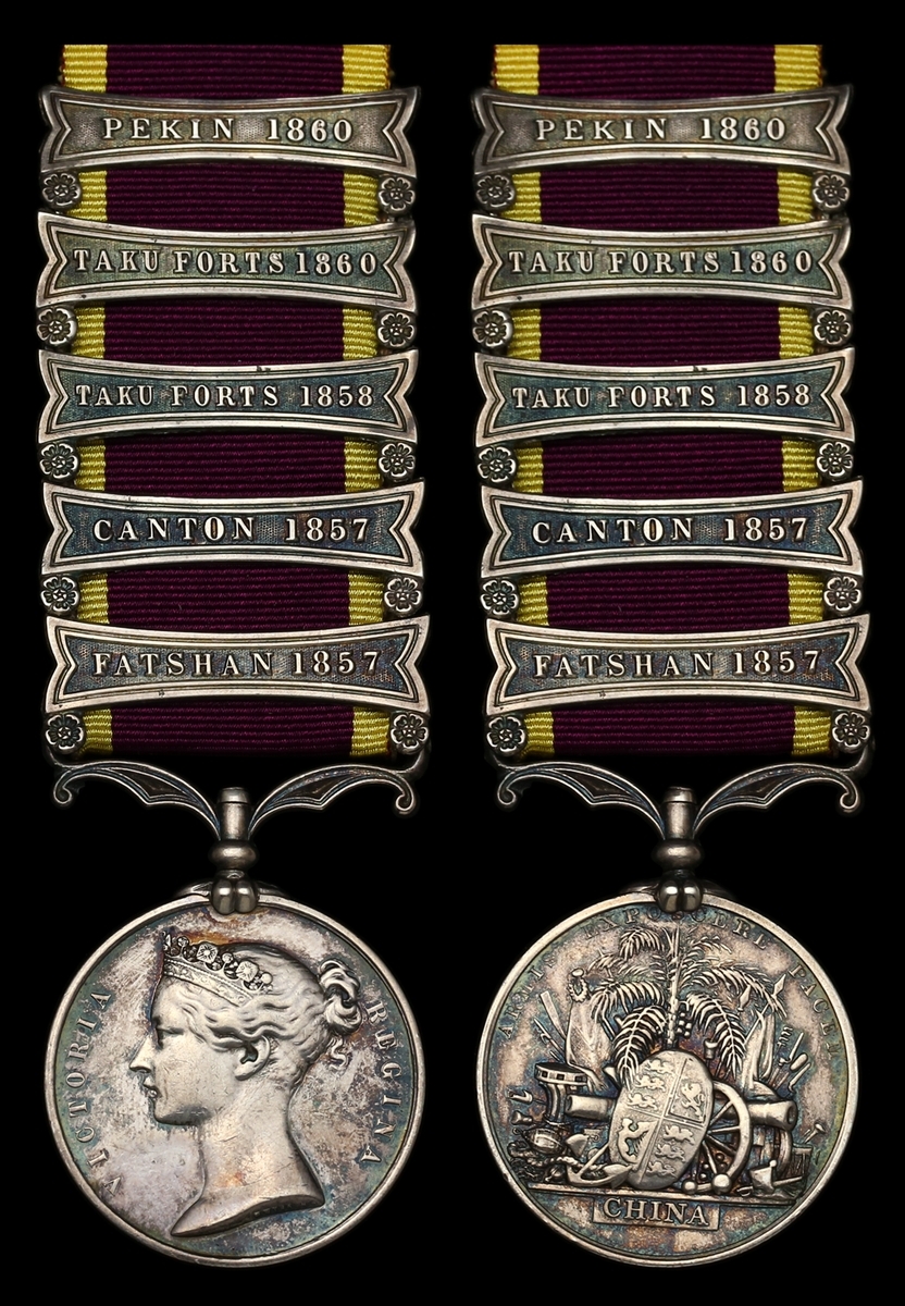 China 1856-60, 5 clasps, Fatshan 1857, Canton 1857, Taku Forts 1858, Taku Forts 1860, Pekin 1860, unnamed as issued, private rivets, a little polished, very fine and rare