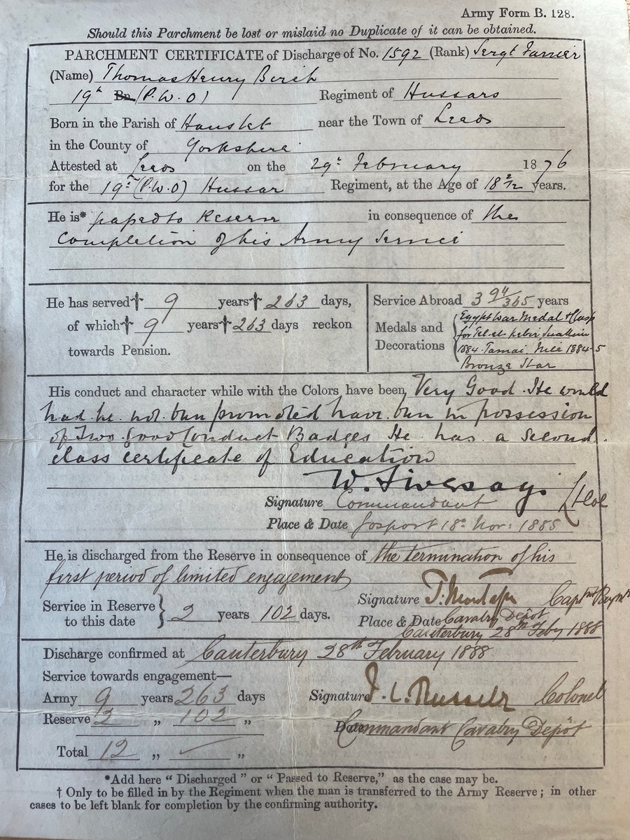 Thomas Henry Birch was born at Hunslet, Leeds in 1868 and enlisted into the 19th Hussars in 1876. According to his obituary: