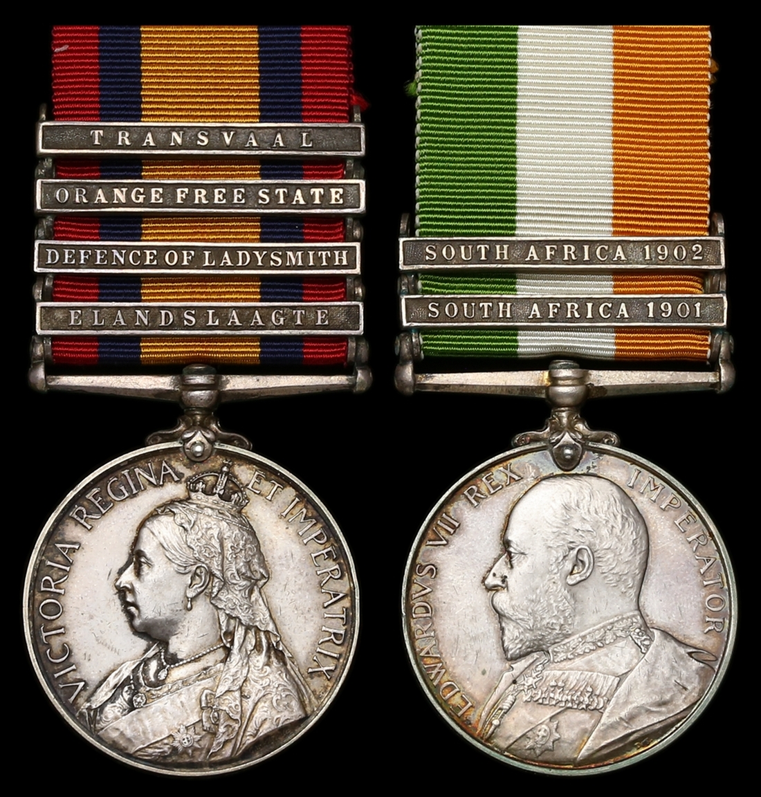 Queen's South Africa 1899-1902, 4 clasps, Elandslaagte, Defence of Ladysmith, Orange Free State, Transvaal (4298. Pte. W. Steel. 5 Lcrs.); King's South Africa 1901-02, 2 clasps, South Africa 1901, South Africa 1902 (4298 Pte W. Steele. 5th Lancers.), very fine (2)