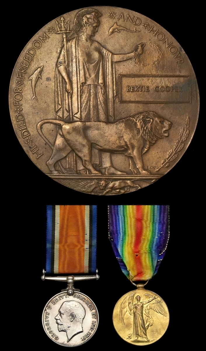British War and Victory Medals (26996 Pte. B. Cooper, Essex R.); Great War Bronze Memorial Plaque (Bertie Cooper), the reverse of the plaque fitted with a soldered metal pin for mounting purposes, otherwise good very fine