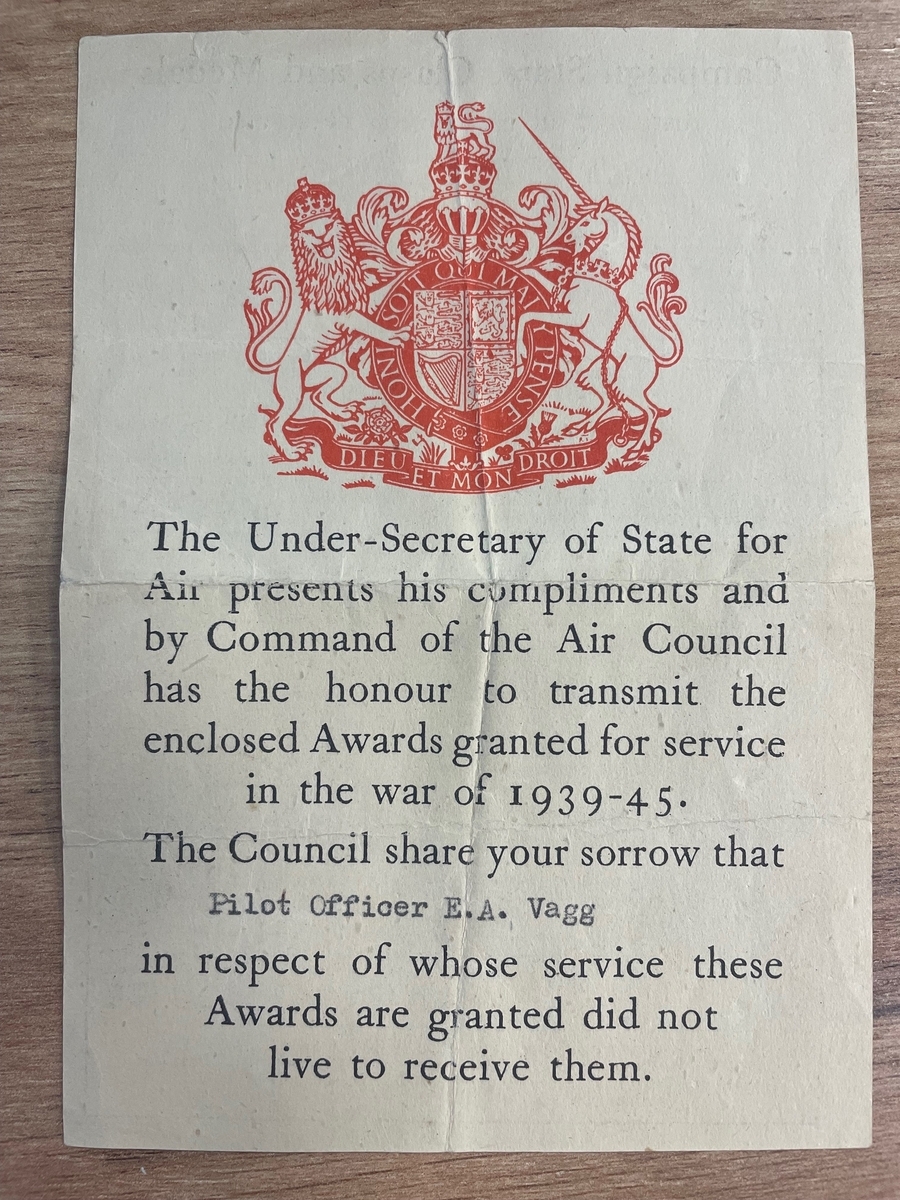 1939-45 Star; Air Crew Europe Star; War Medal 1939-45, together with his Air Ministry condolence slip in the name of 'Pilot Officer E. A. Vagg', extremely fine (3)