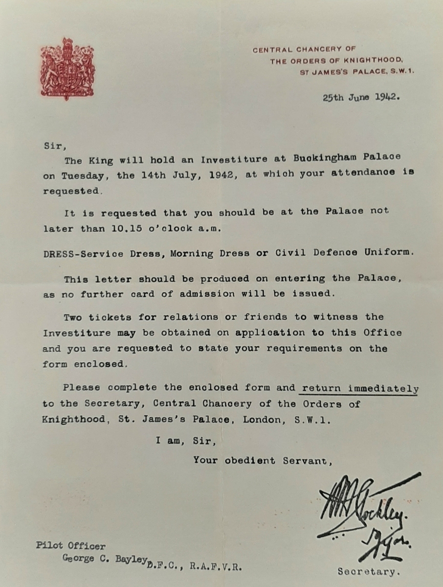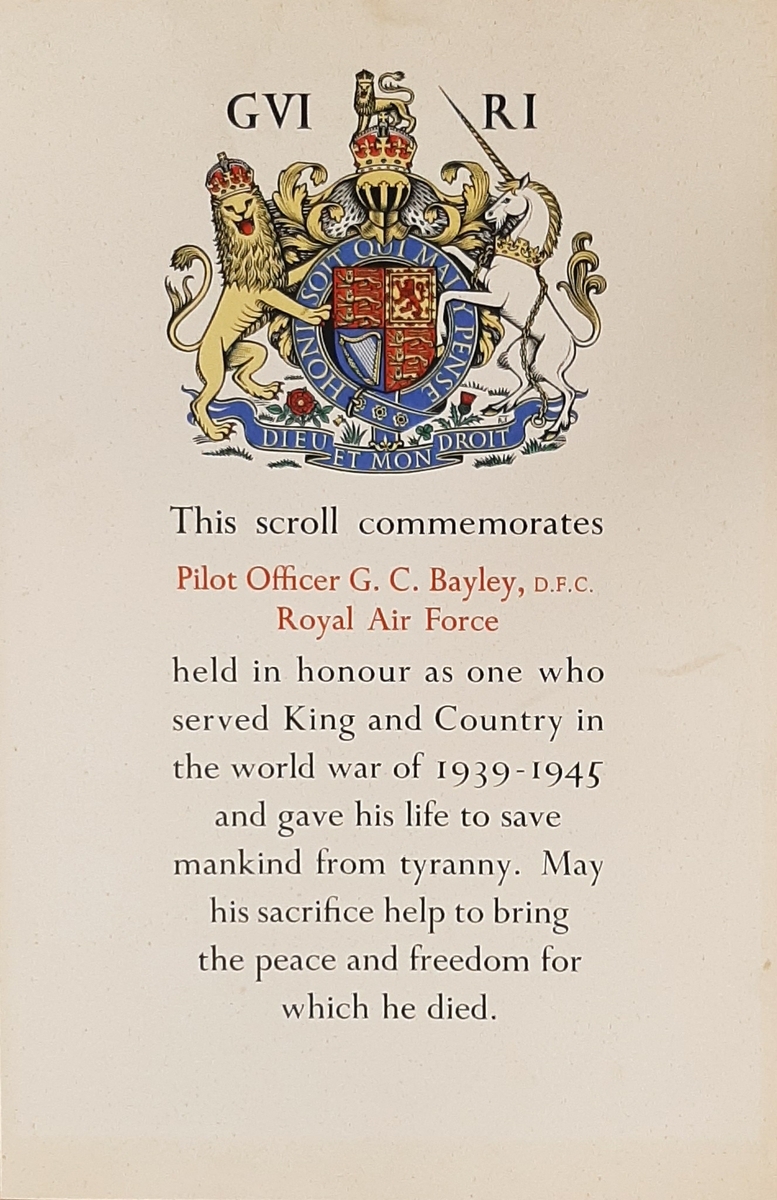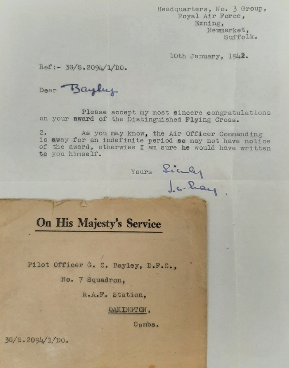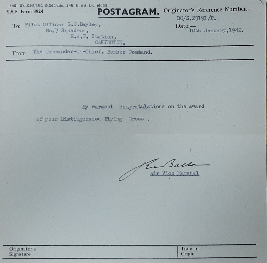 While serving with this unit he was presented with his D.FC. at Buckingham Palace on 14 July 1942. Just fifteen days later he was part of another 'War Operation' raid over Hamburg on 28 July. Bayley was hit by flak near Bremen and crashed in the suburbs at 2.45 the morning of 29 July, his entire crew was killed and Bayley himself mortally wounded. He died at the Prisoner of War Section of Rotenburg/Hann Hospital; sold together with copied research and a comprehensive archive of original material comprising: