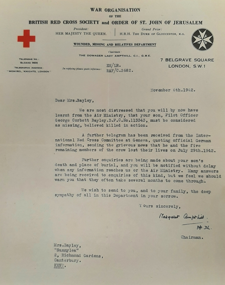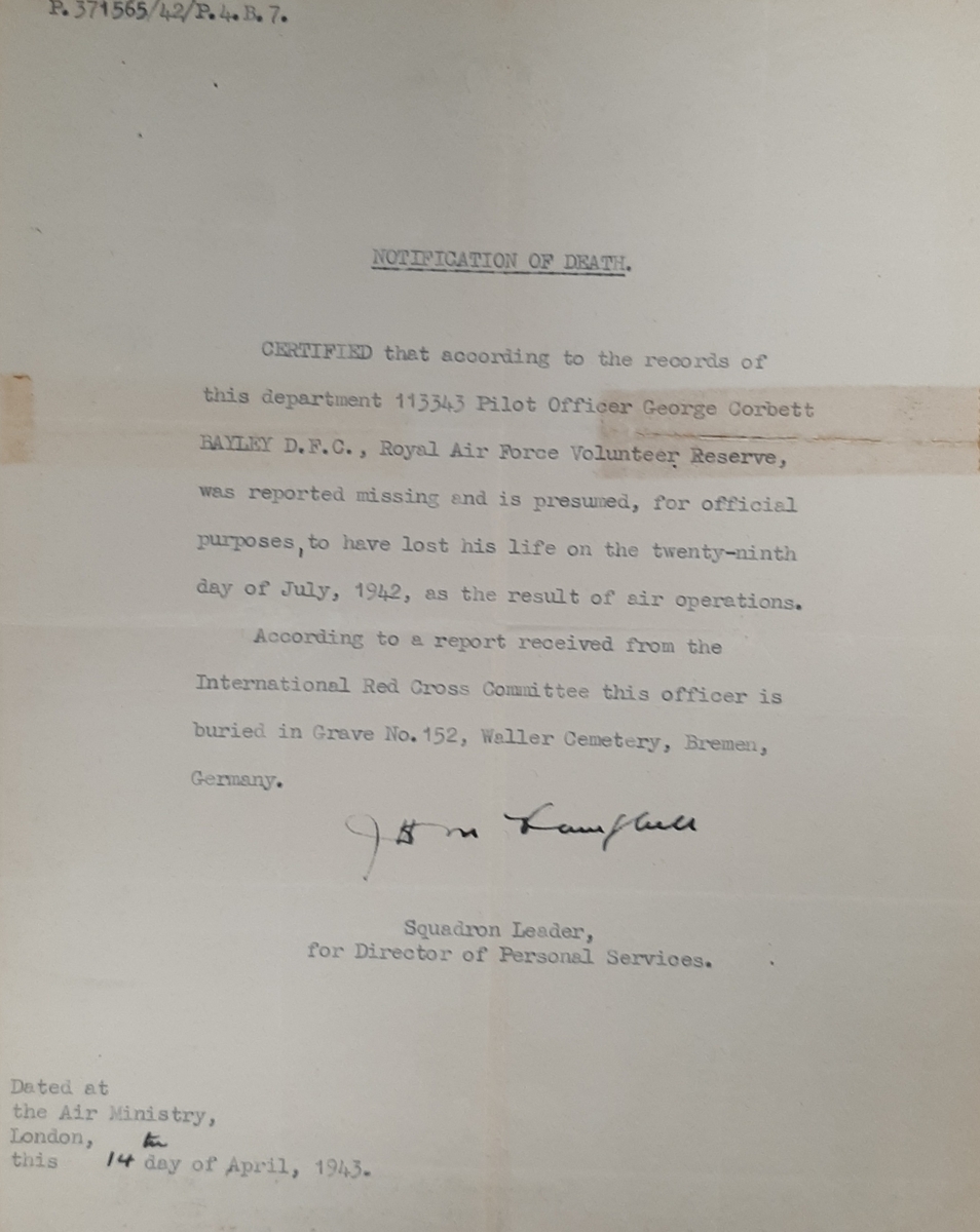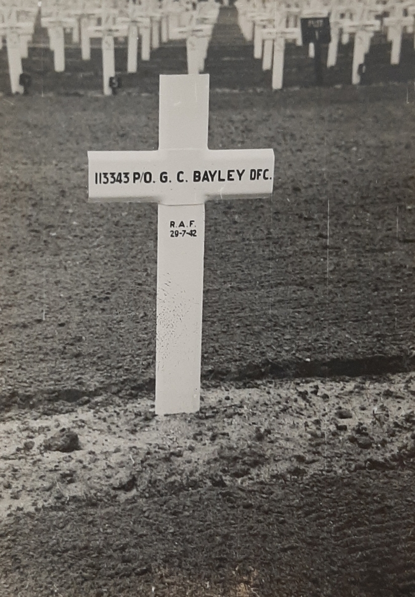 George Corbett Bayley was born on 10 December 1918, the son of Herbert and Nancy Bayley of Kent. He attended Ashford Grammer School in Kent, he is commemorated upon their war memorial. Bayley's father died in 1930 and as such he appears upon the 1939 census with his mother and brother at 'Sellindge', Ramsgate Road, Broadstairs, Kent. At the time Bayley was working at the Municipal Engineering (Surveyor's) Department, Broadstairs and a member of the Civil Air Guard.