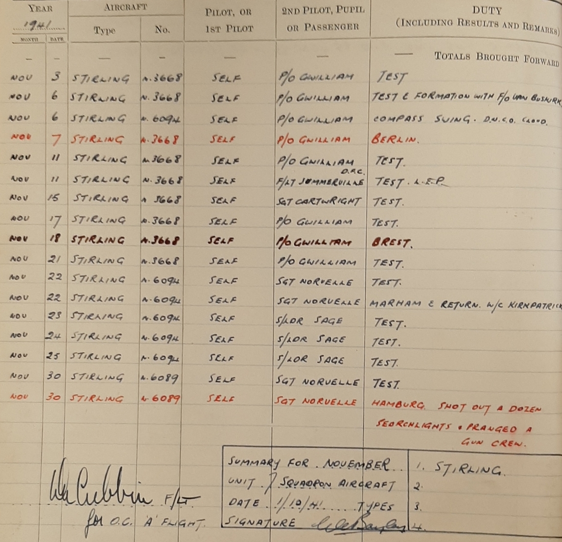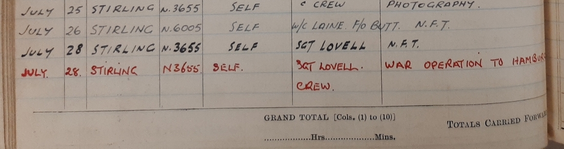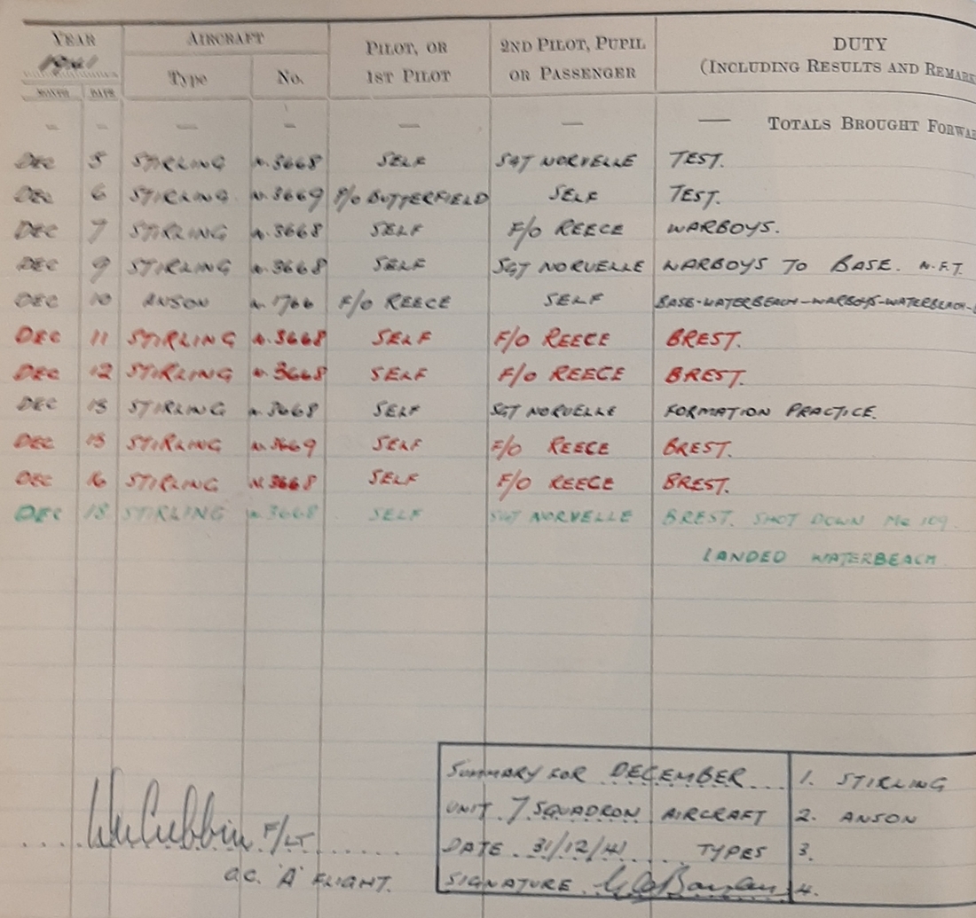 Starting to fly as 1st Pilot in September 1941 his first mission was over Kiel before later joining one of the Squadron's first raids over Brest on 18 November. Appointed Flight Sergeant with No. 7 Squadron on 28 November 1941 he was present for a major raid on Hamburg on 30 November, his log book relates the what followed stating: 'Hamburg shot out a dozen searchlights & pranged a gun crew'. The Daily Express followed up on this with an article which states: