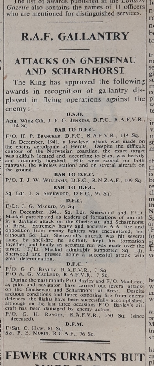 'During the past month, Pilot Officer Bayley and Flying Officer MacLeod, as pilot and navigator respectively, have carried out several attacks on the enemy warships Gneisenau and Scharnhorst at Brest. Despite arduous conditions and fierce opposing fire from enemy defences, the flights have been successfully accomplished although on the last 3 occasions Pilot Officer Bayley's aircraft has been damaged by enemy action. Throughout these missions, which have entailed a high degree of navigational skill and expert knowledge, Flying Officer MacLeod has fulfilled his duties with conspicuous success. Pilot Officer Bayley and Flying Officer MacLeod have always displayed great courage, skill and determination throughout the many sorties in which they have taken part.'